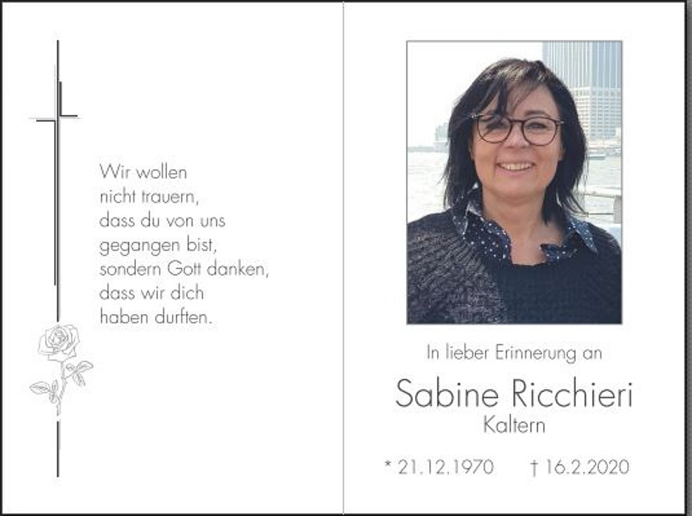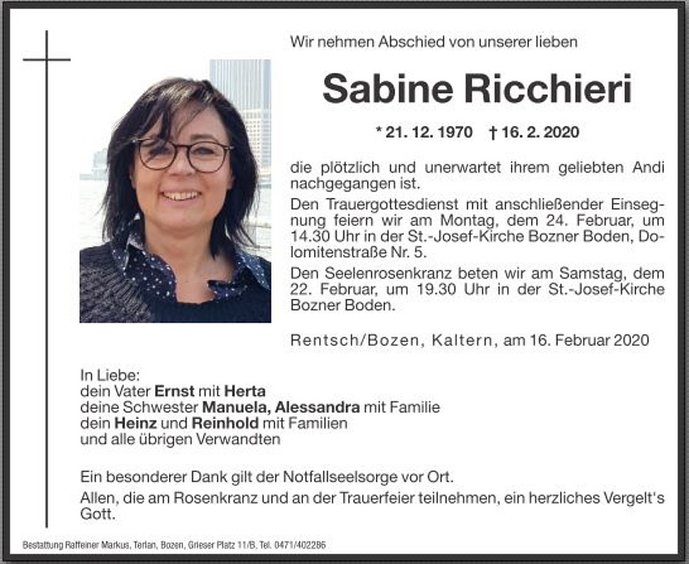 Den Trauergottesdienst mit anschlieβender Einsegnung feiern wir am Montag, dem 24. Februar, um 14.30 Uhr in der St. Josef-Kirche Bozner-Boden, Dolomitenstrasse Nr. 5.