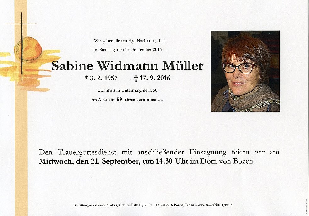 Den Trauergottesdienst mit anschlieβender Einsegnung feiern wir am Mittwoch, den 21. September, um 14.30 Uhr im Dom von Bozen.