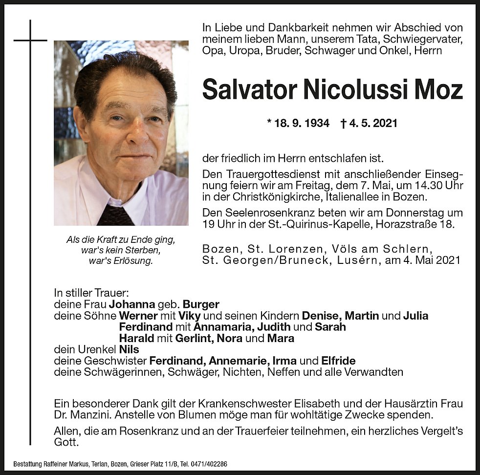 Den Trauergottesdienst mit anschlieβender Einsegnung feiern wir am Freitag, dem 7. Mai, um 14.30 Uhr in der Christ-König-Kirche, Italienallee in Bozen.