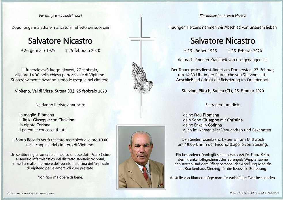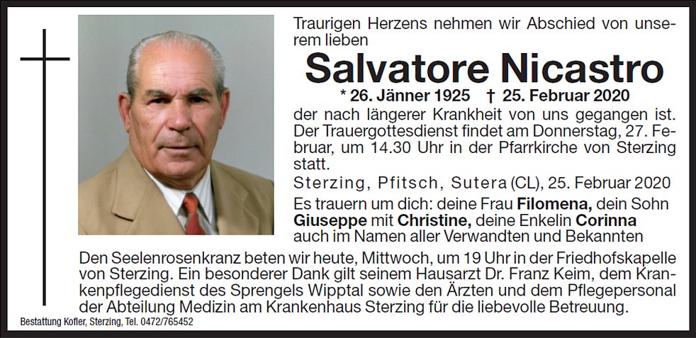 Ein besonderer Dank gilt seinem Hausarzt Dr. Franz Keim, dem Krankenpflegedienst des Sprengels Wipptal sowie den Ärzten und dem Pflegepersonal der Abteilung Medizin am Krankenhaus Sterzing für die liebevolle Betreuung.