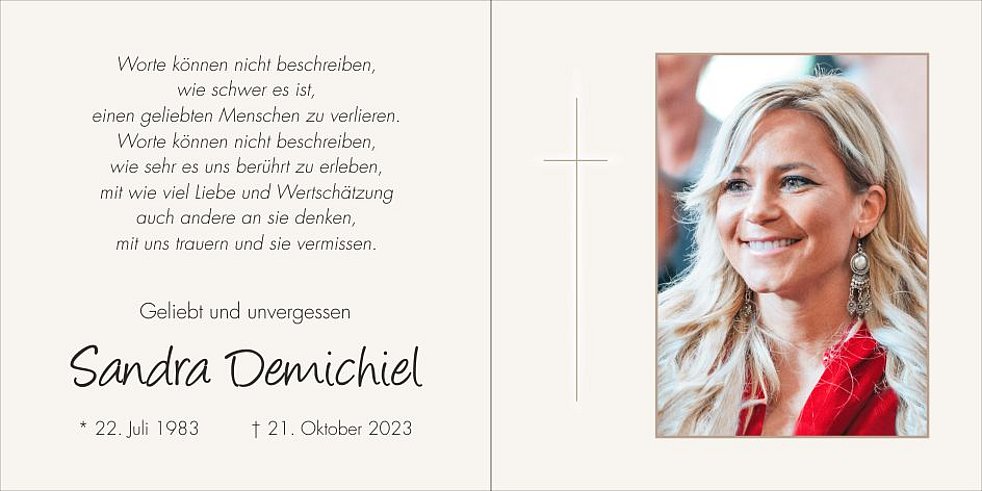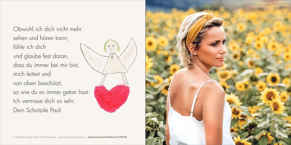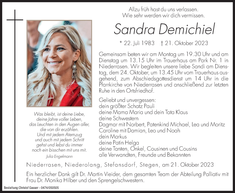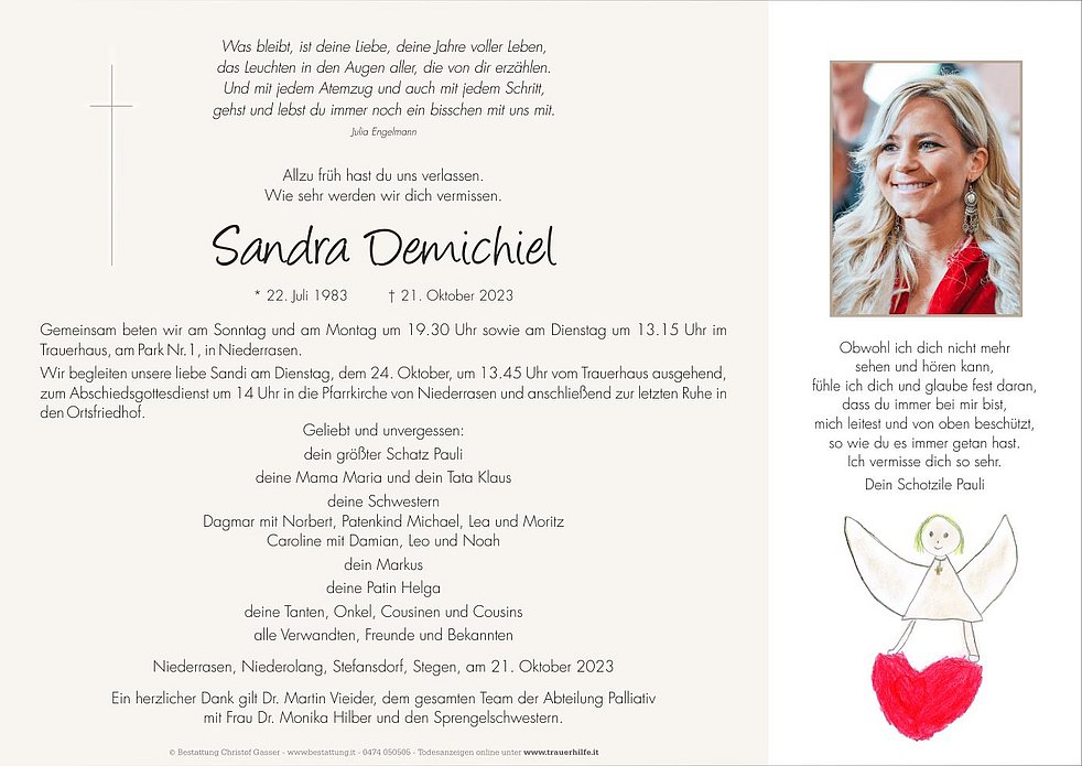 Wir begleiten unsere liebe Sandi am Dienstag, dem 24. Oktober, um 13.45 Uhr vom Trauerhaus ausgehend, zum Abschiedsgottesdienst um 14 Uhr in die Pfarrkirche von Niederrasen und anschließend zur letzten Ruhe in den Ortsfriedhof.