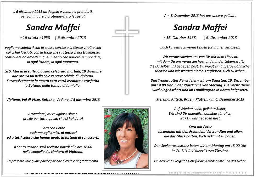 Un sincero e dovuto ringraziamento a tutta l’equipe medica e staff infermieristico del reparto di Urologia dell’Ospedale di Bressanone per l’apprezzata professionalità e umanità riservate a Sandra. Un ringraziamento anche a tutto il Reparto delle Cure Palliative di Bolzano per le amorevoli cure prestate.