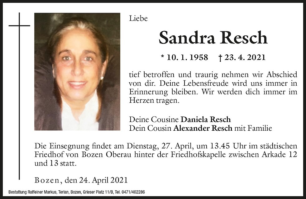 Die Einsegnung findet am Dienstag, 27. April, um 13.45 Uhr im städtischen Friedhof von Bozen Oberau hinter der Friedhofskapelle zwischen Arkade 12 und 13 statt.