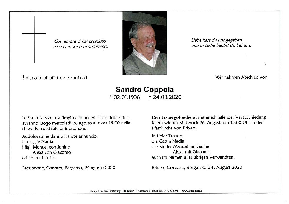 Den Trauergottesdienst mit anschließender Verabschiedung feiern wir am Mittwoch, 26. August, um 15.00 Uhr in der Pfarrkirche von Brixen.