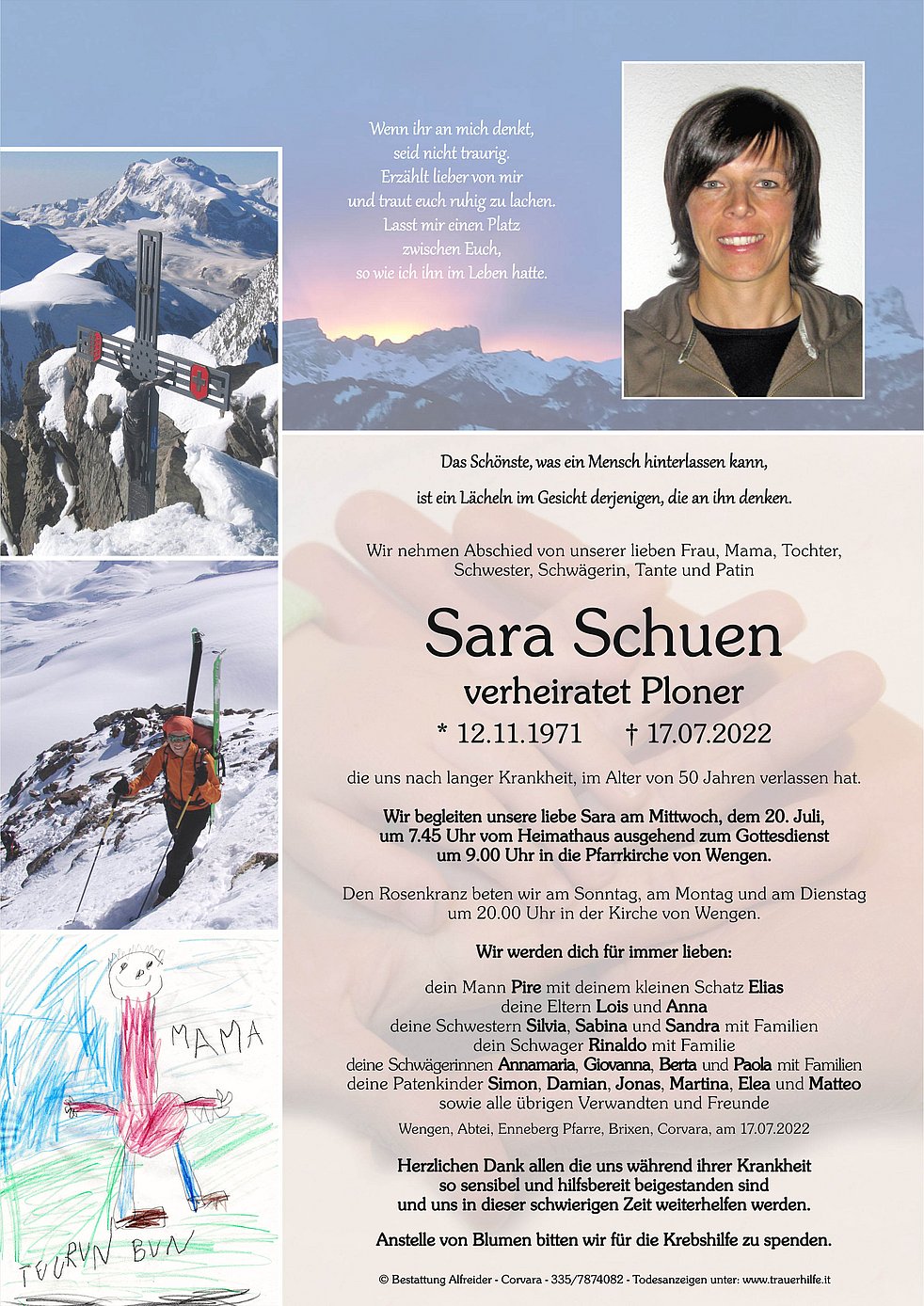 Wir begleiten unsere liebe Sara am Mittwoch, dem 20. Juli, um 7.45 Uhr vom Heimathaus ausgehend zum Gottesdienst um 9.00 Uhr in die Pfarrkirche von Wengen.
