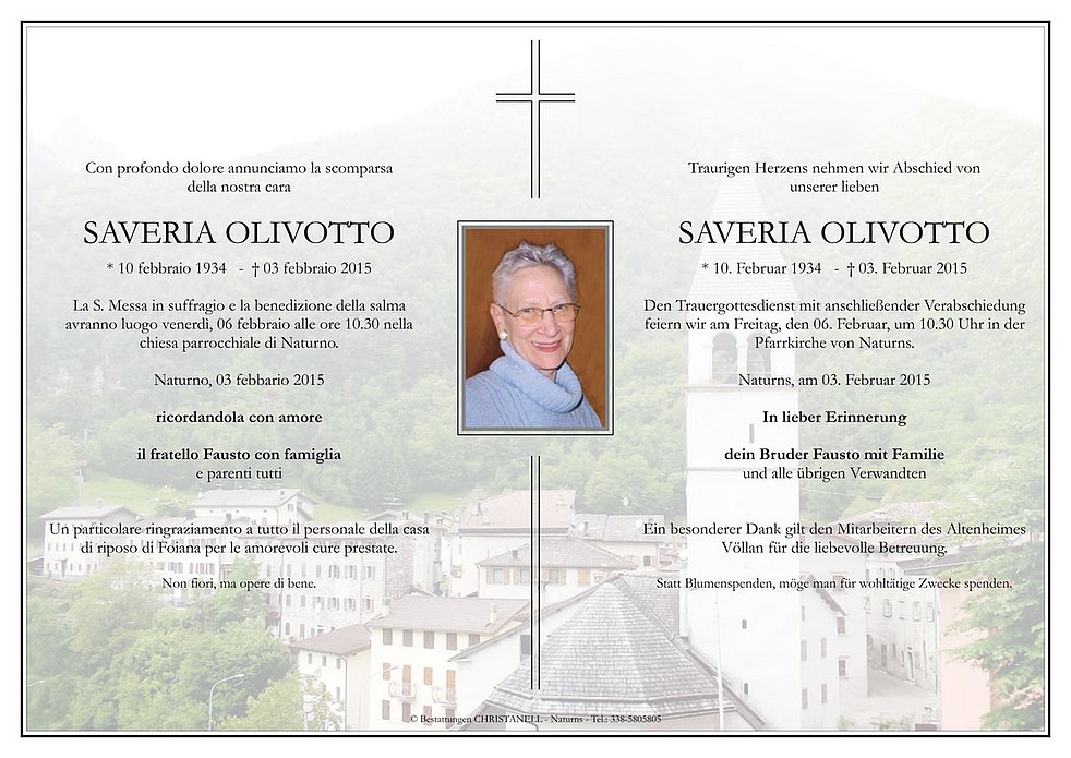 Un particolare ringraziamento a tutto il personale della casa di riposo di Foiana per le amorevoli cure prestate.
