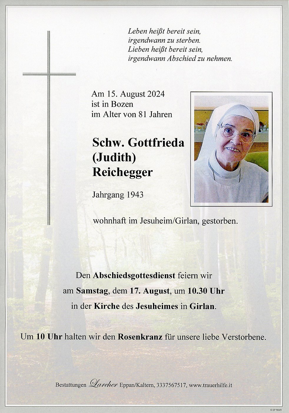 Judith ist am 30. März 1943 in Uttenheim geboren. Sie wurde 1968 Kreuzschwester und verbrachte ihr Ordensleben zuerst als Pflegerin in Arco, Brixen und Bruneck und später, 26 Jahre lang, in der Altenpastoral der Pfarre Brixen. Die letzten Jahre litt sie wiederholt an ernsten Krankheiten. Zuletzt war sie im Krankenhaus Bozen aufgenommen, wo der Herr sie am Fest Maria Himmelfahrt zu sich rief.