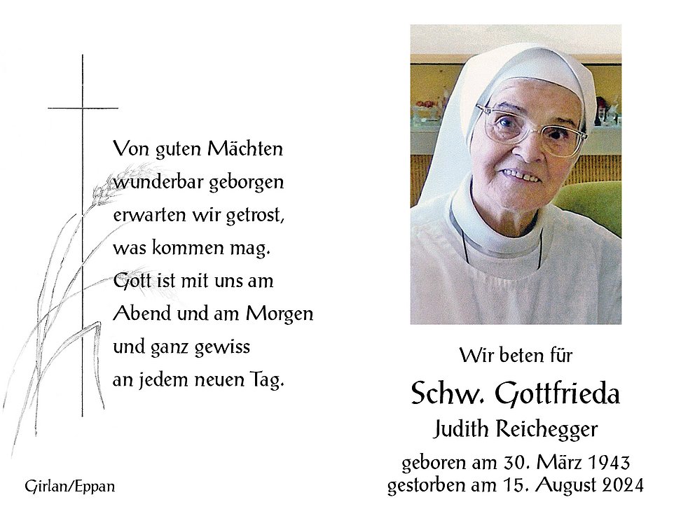 Wir danken all jenen die Schw. Gottfrieda in der Krankheit unterstützt oder gepflegt haben, hauptsächlich in Martinsbrunn, im Jesuheim und im Krankenhaus Bozen. Ebenso danken wir für die Teilnahme am Rosenkranz und am Abschiedsgottesdienst.