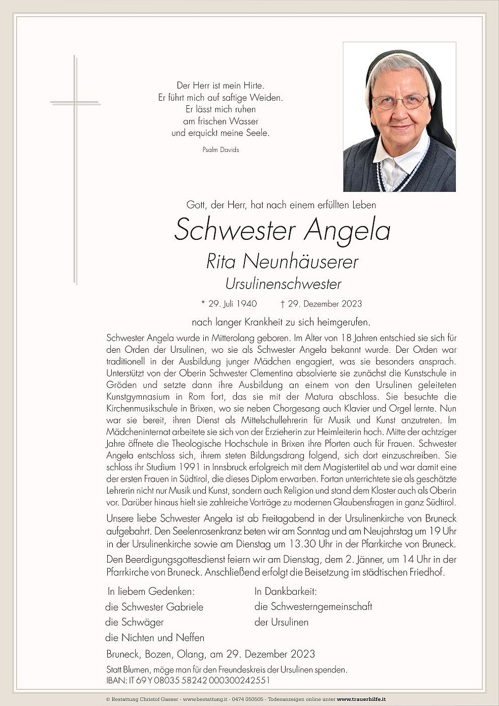 Unsere liebe Schwester Angela ist ab Freitagabend in der Ursulinenkirche von Bruneck aufgebahrt. Den Seelenrosenkranz beten wir am Sonntag und am Neujahrstag um 19 Uhr in der Ursulinenkirche sowie am Dienstag um 13.30 Uhr in der Pfarrkirche von Bruneck.