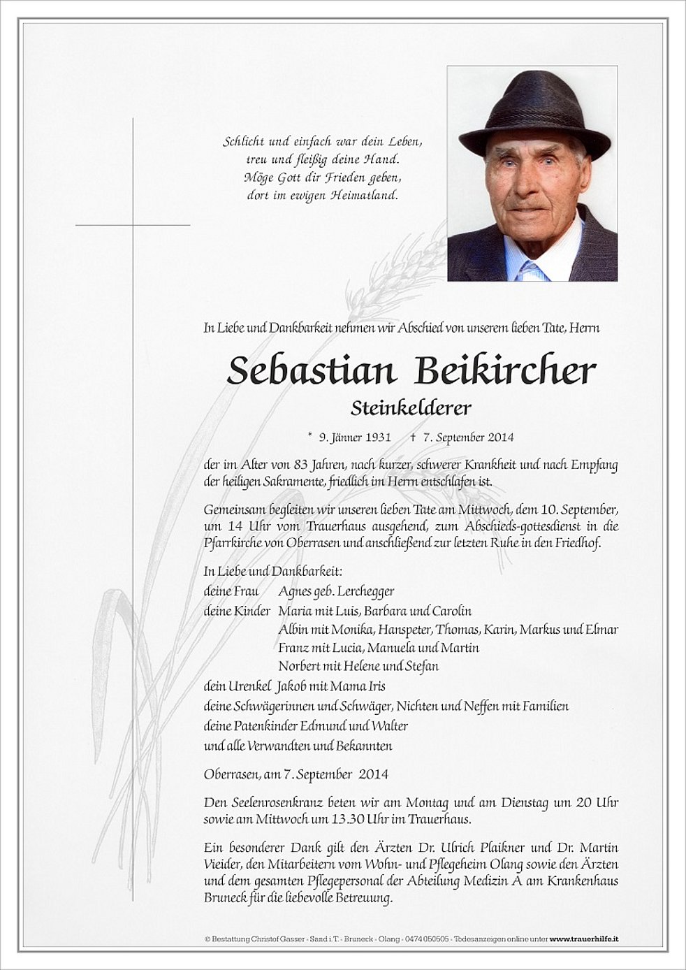 Gemeinsam begleiten wir unseren lieben Tate am Mittwoch, dem 10. September, um 14 Uhr vom Trauerhaus ausgehend, zum Abschieds-gottesdienst in die Pfarrkirche von Oberrasen und anschließend zur letzten Ruhe in den Friedhof.