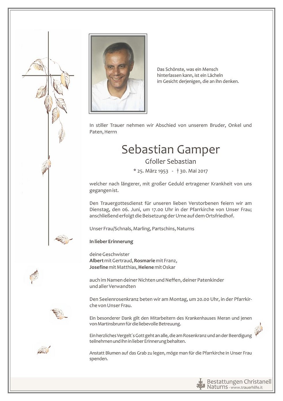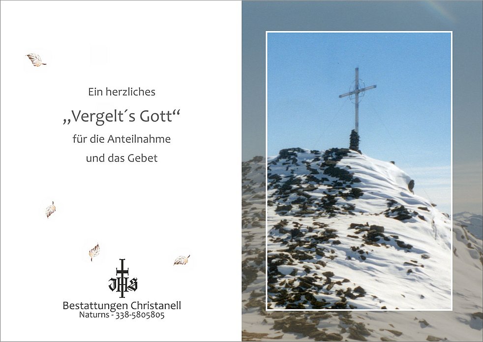Den Trauergottesdienst für unseren lieben Verstorbenen feiern wir am Dienstag, den 06. Juni, um 17.00 Uhr in der Pfarrkirche von Unser Frau; anschließend erfolgt die Beisetzung der Urne auf dem Ortsfriedhof.