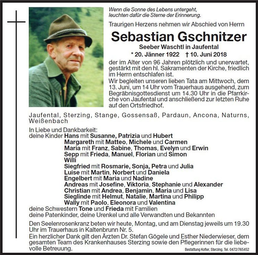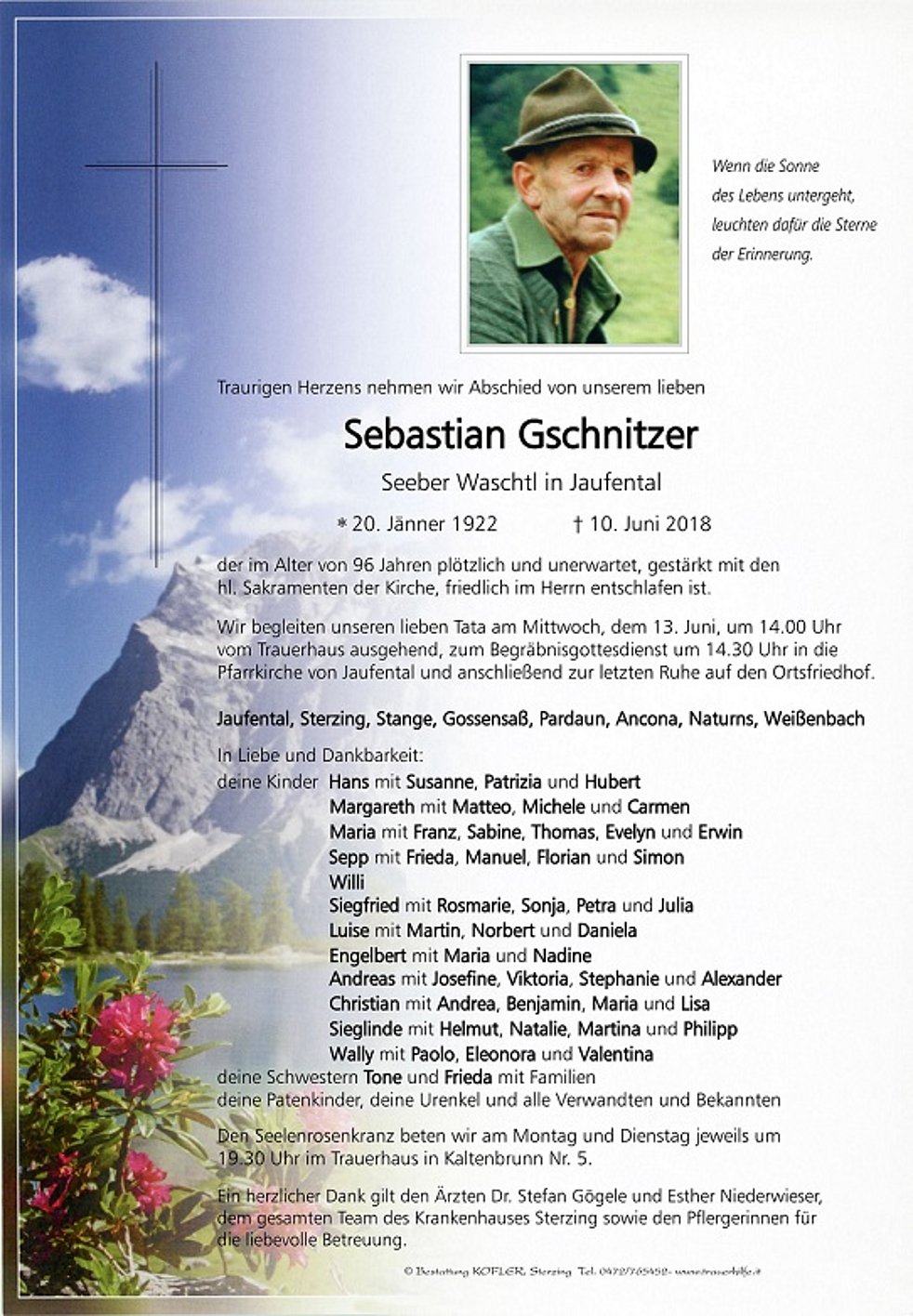 Wir begleiten unseren lieben Tata am Mittwoch, dem 13. Juni, um 14.00 Uhr vom Trauerhaus ausgehend, zum Begräbnisgottesdienst um 14.30 Uhr in die Pfarrkirche von Jaufental und anschließend zur letzten Ruhe auf den Ortsfriedhof.