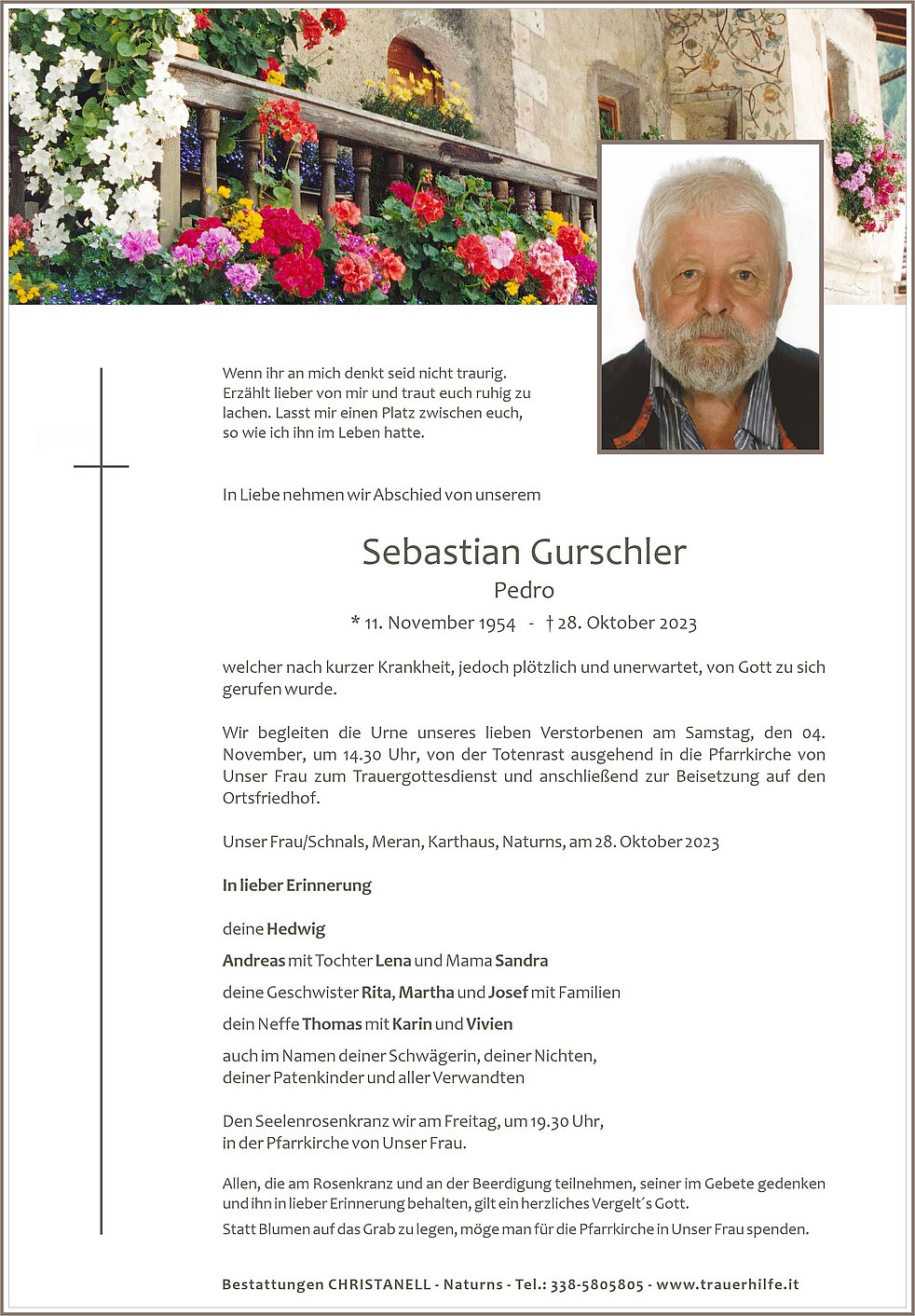 Wir begleiten die Urne unseres lieben Verstorbenen am Samstag, den 04. November, um 14.30 Uhr, von der Totenrast ausgehend in die Pfarrkirche von Unser Frau zum Trauergottesdienst und anschließend zur Beisetzung auf den Ortsfriedhof.