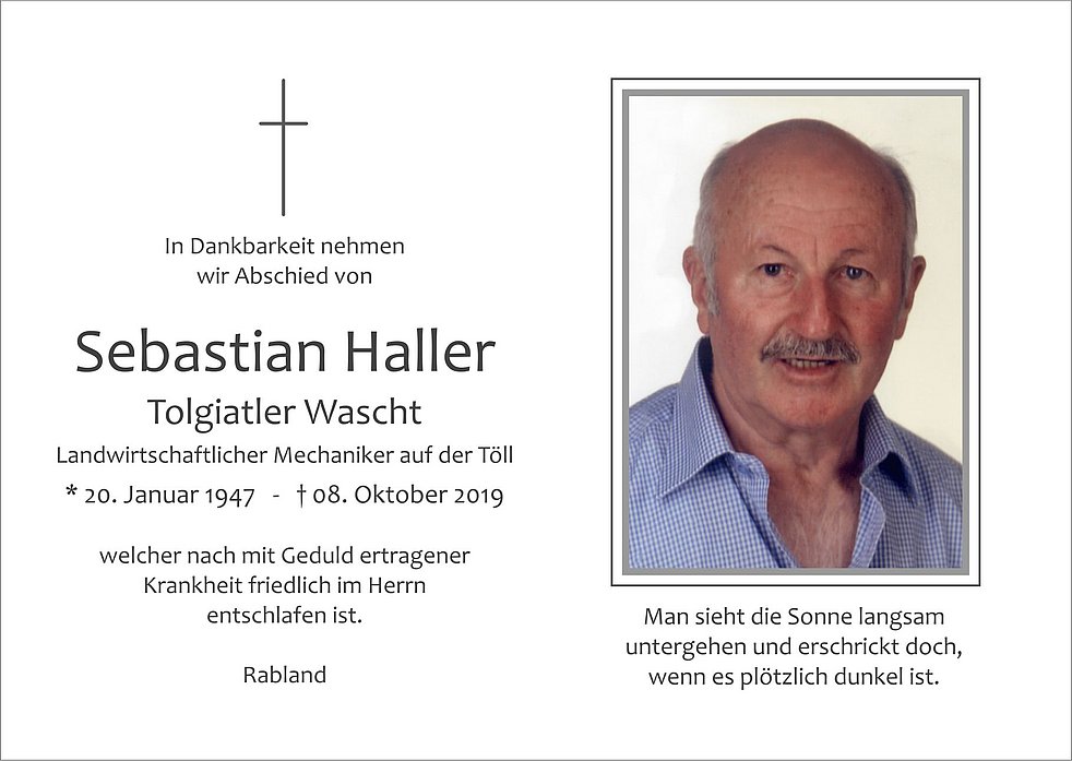 Den Trauergottesdienst mit anschließender Verabschiedung feiern wir am Freitag, den 11. Oktober, um 14.30 Uhr, in der Pfarrkirche von Rabland.