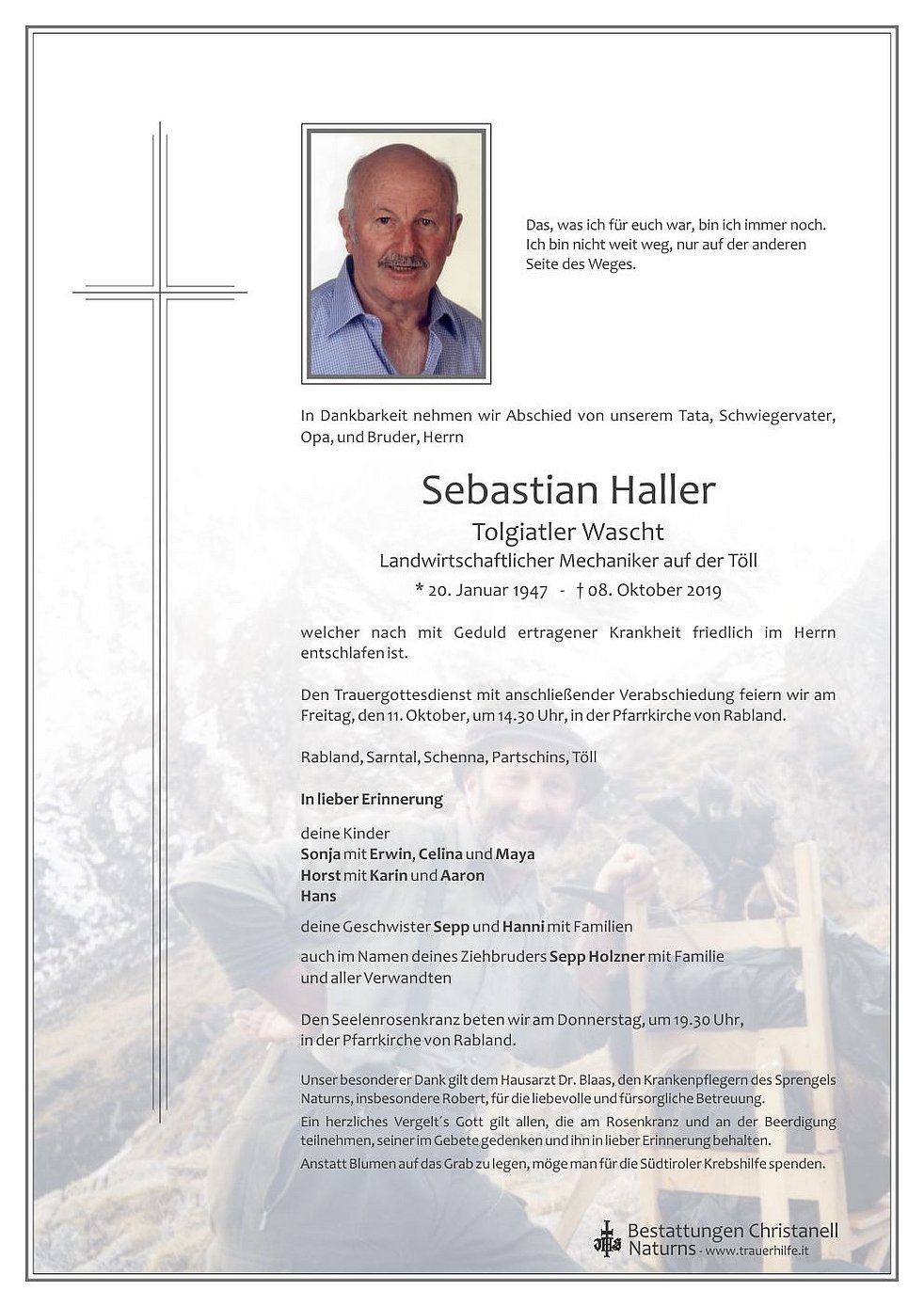 Anstatt Blumen auf das Grab zu legen, möge man für die Südtiroler Krebshilfe spenden.