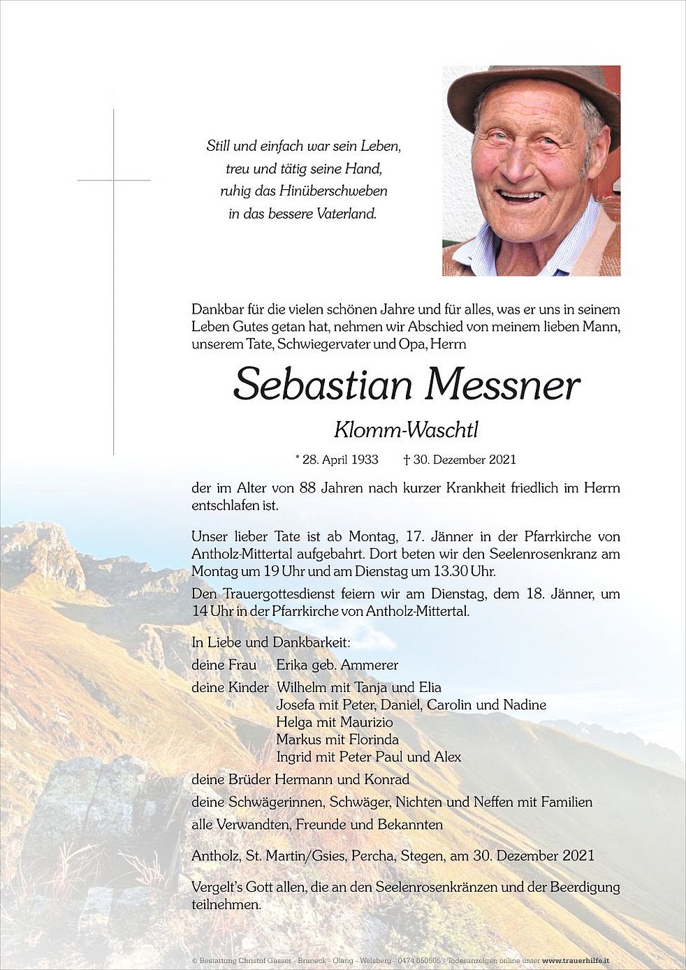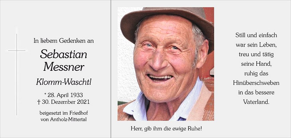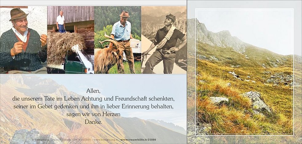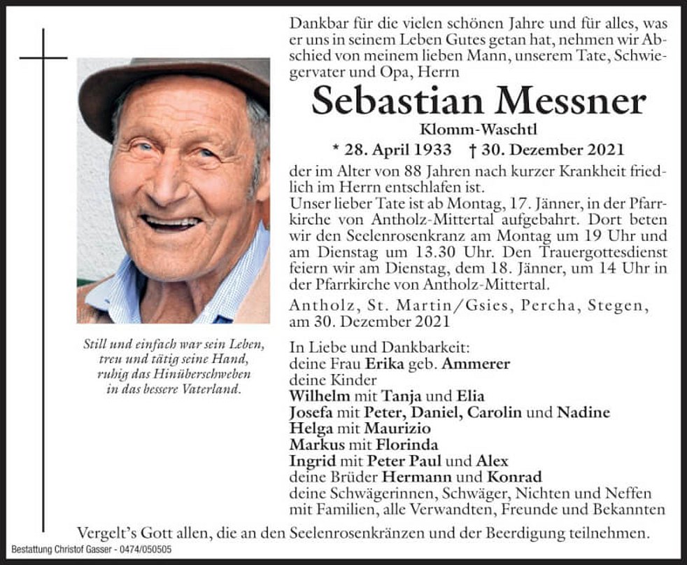 Unser lieber Tate ist ab Montag, 17. Jänner in der Pfarrkirche von Antholz-Mittertal aufgebahrt. Dort beten wir den Seelenrosenkranz am Montag um 19 Uhr und am Dienstag um 13.30 Uhr.