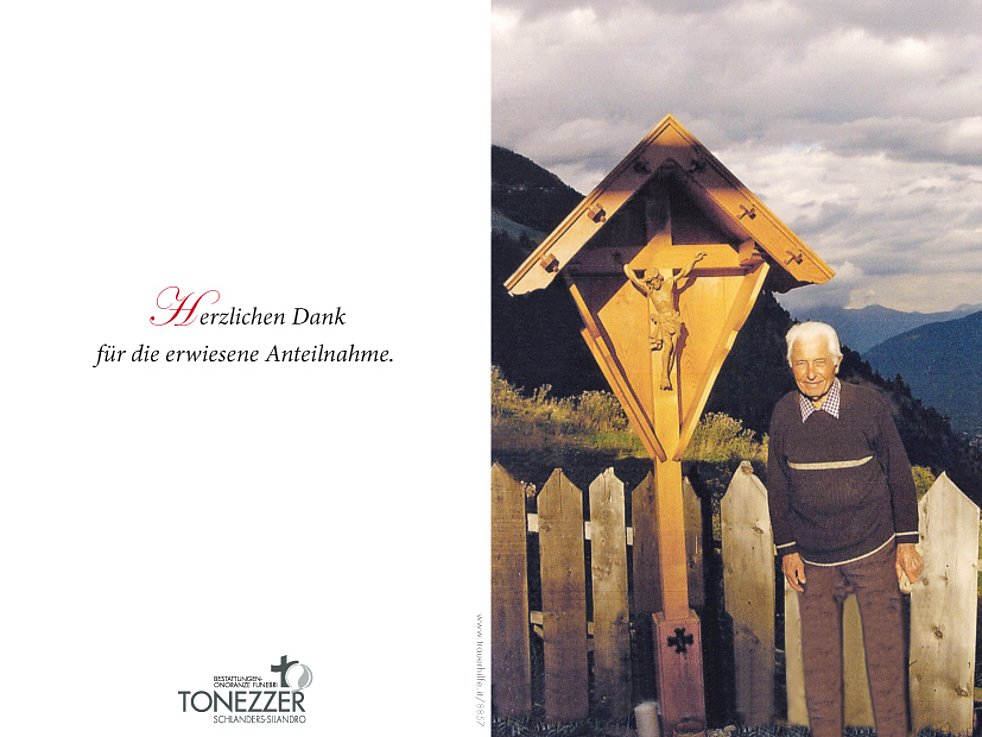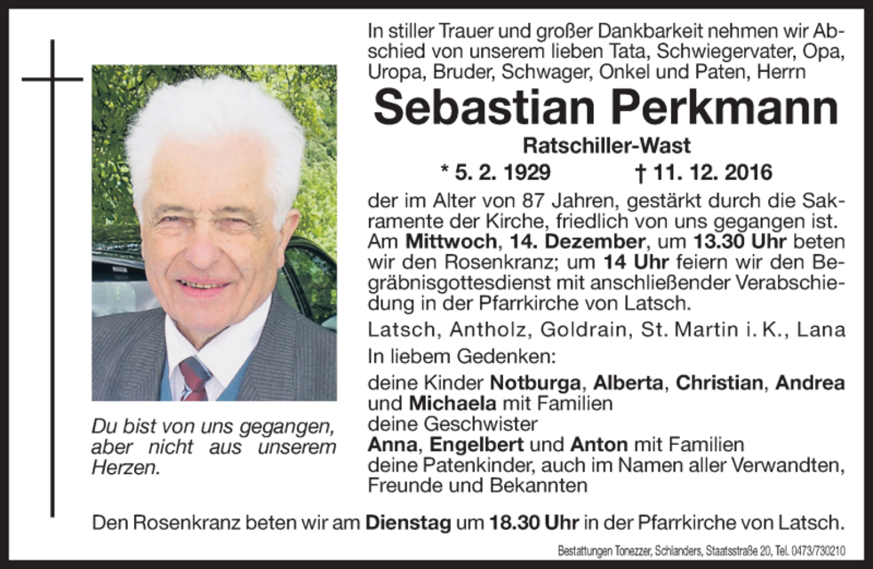 Am Mittwoch, 14. Dezember, um 13.30 Uhr beten wir den Rosenkranz; um 14 Uhr feiern wir den Begräbnisgottesdienst mit anschließender Verabschiedung in der Pfarrkirche von Latsch.
