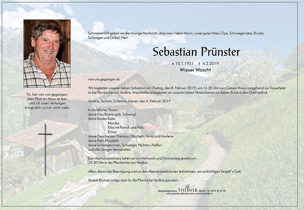 Wir begleiten unseren lieben Sebastian am Freitag, den 8. Februar 2019, um 14.30 Uhr vom Gasser-Kreuz ausgehend zur Trauerfeier in die Pfarrkirche von Verdins. Anschließend begleiten wir unseren lieben Verstorbenen zur letzten Ruhe in den Ortsfriedhof.