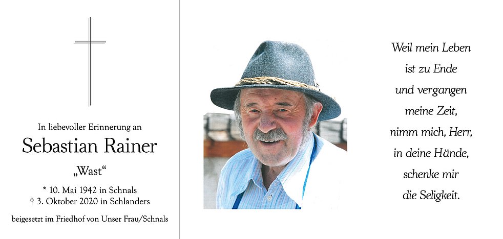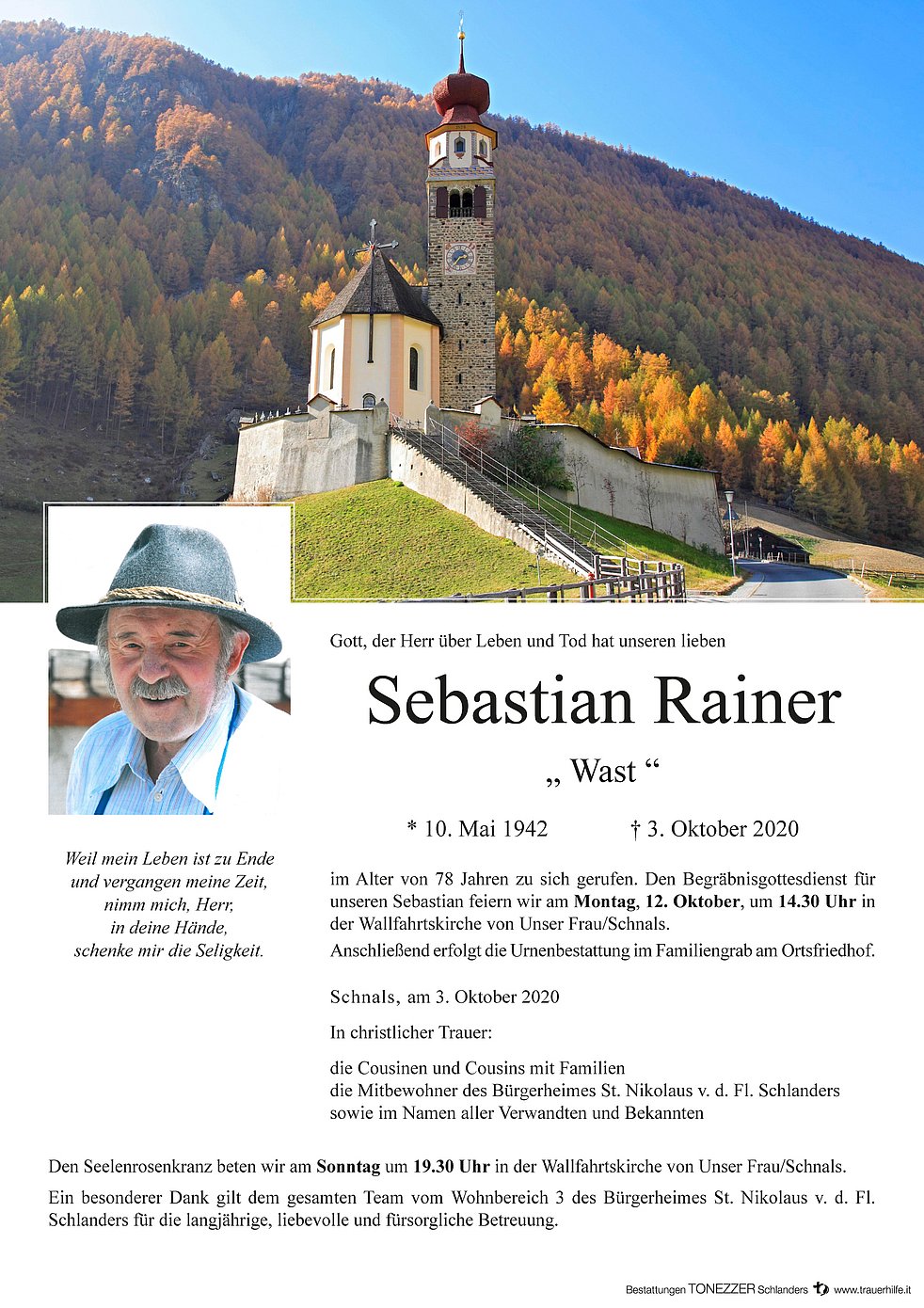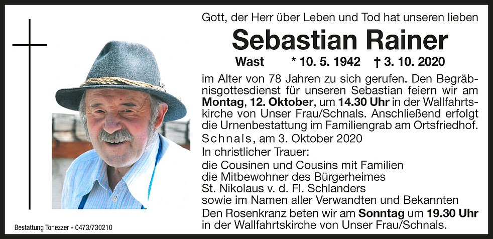 Den Begräbnisgottesdienst für unseren Sebastian feiern wir am Montag, 12. Oktober, um 14.30 Uhr in der Wallfahrtskirche von Unser Frau/Schnals.