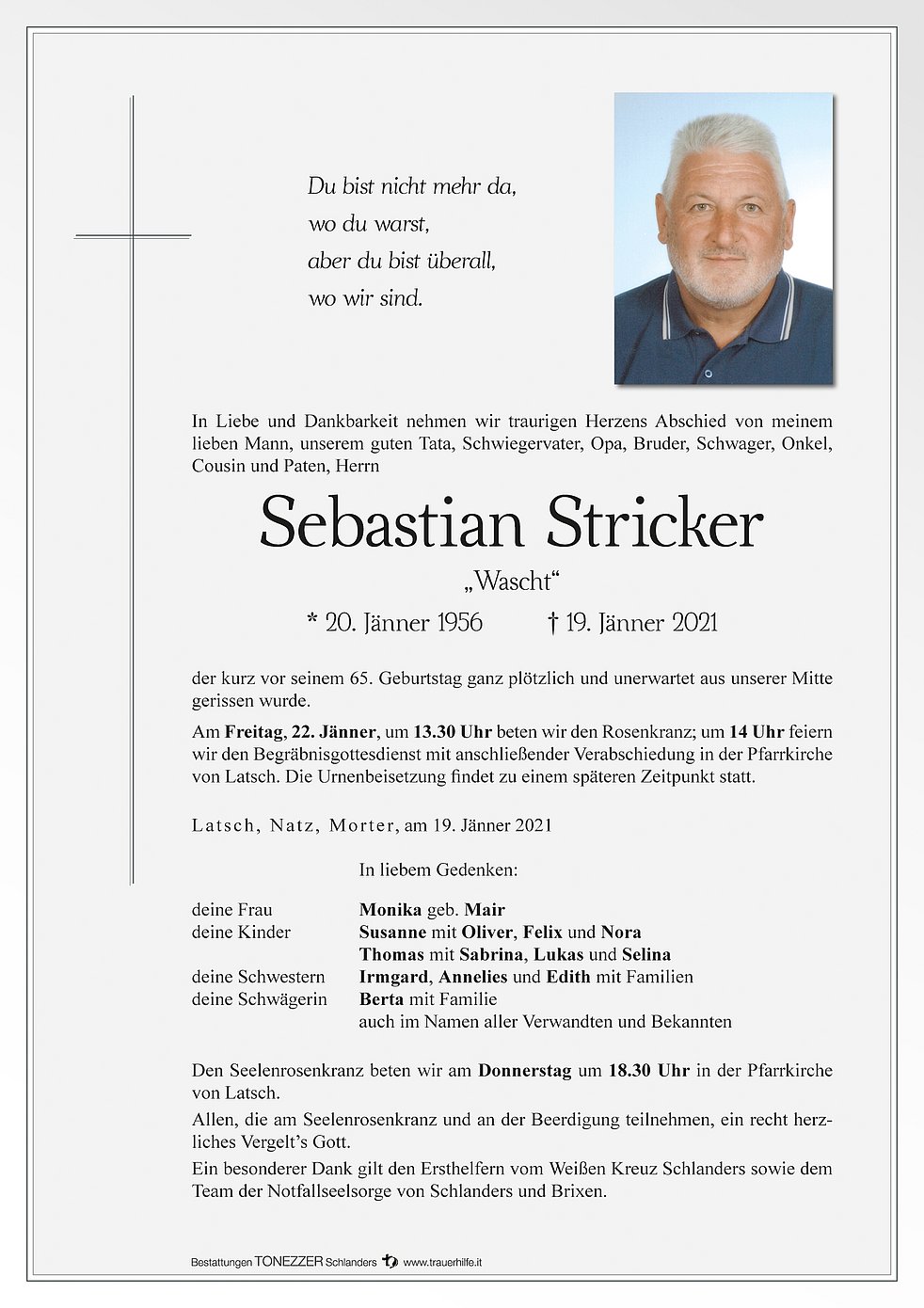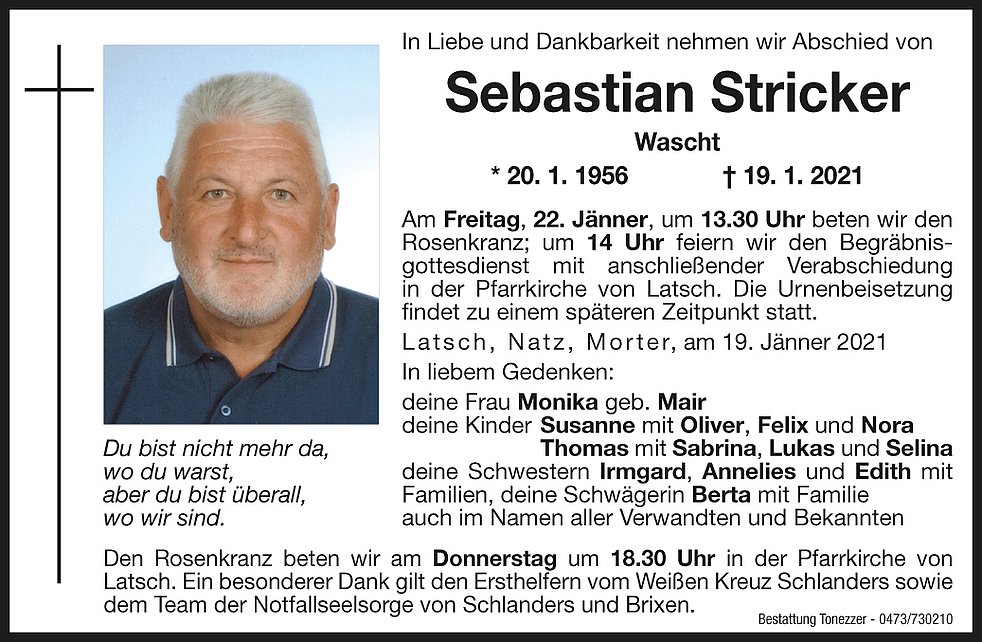 Am Freitag, 22. Jänner, um 13.30 Uhr beten wir den Rosenkranz; um 14 Uhr feiern wir den Begräbnisgottesdienst mit anschließender Verabschiedung in der Pfarrkirche von Latsch.