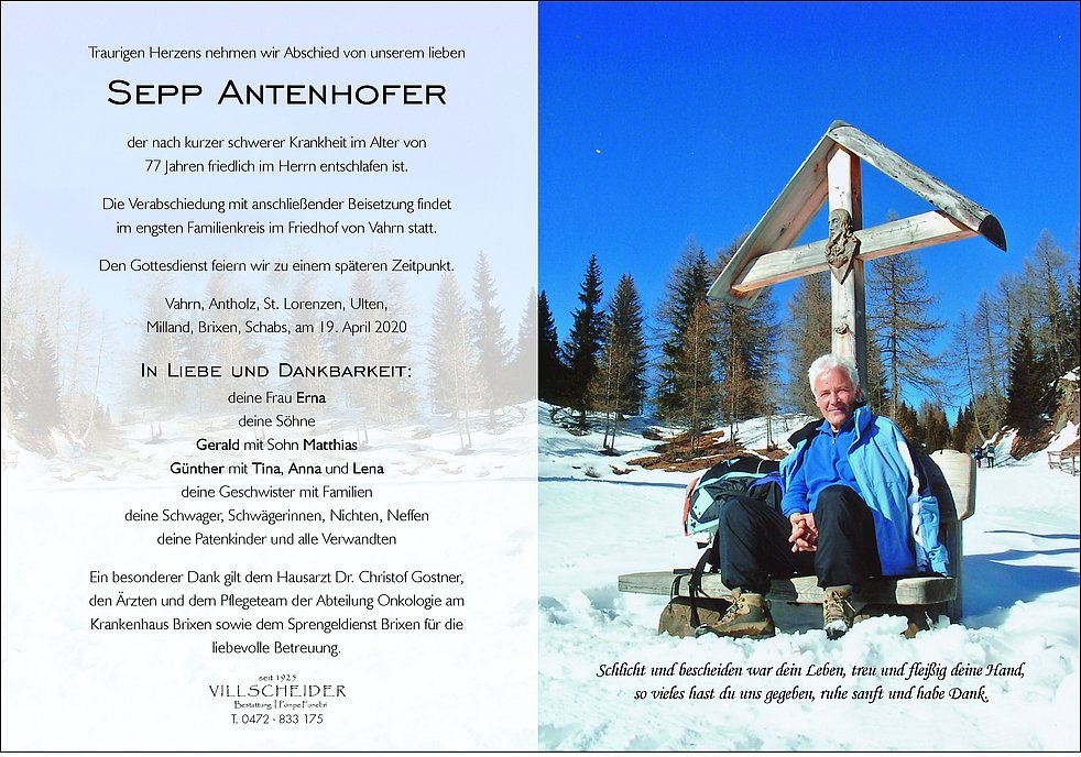 Möchten Euch unser Beileid audrücken. Jetzt konn do Sepp ruhen, sicher in an schianen ort. I woass, wie groass der Schmerz ist.