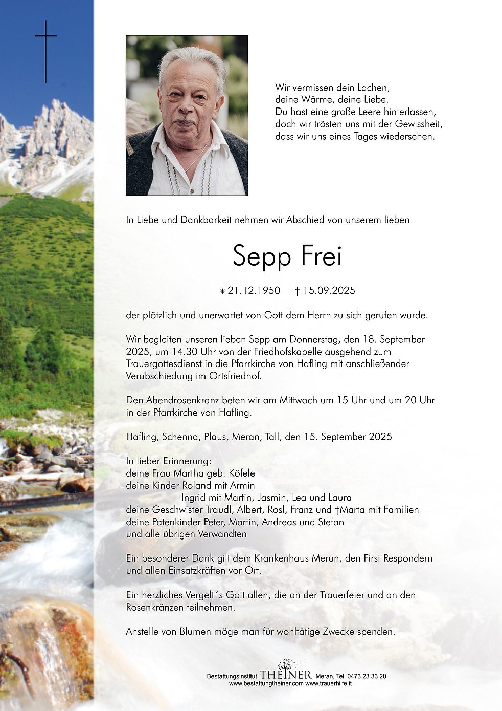 Wir begleiten unseren lieben Sepp am Donnerstag, den 18. September 2025, um 14.30 Uhr von der Friedhofskapelle ausgehend zum Trauergottesdienst in die Pfarrkirche von Hafling mit anschließender Verabschiedung im Ortsfriedhof.