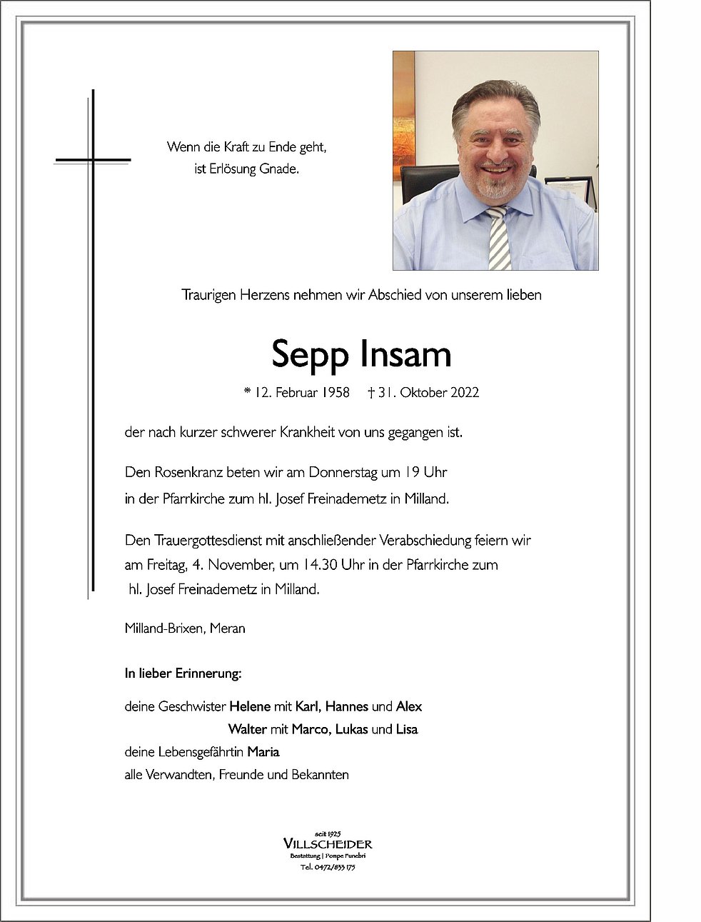Lieber Sepp, ich bin so traurig, dass du nicht mehr bei uns bist. Du warst ein ganz wichtiger Mensch in meinem Leben und ich bin dankbar dir begegnet zu sein. Fast vierzig Jahre warst du mir ein guter Freund, auf den ich mich immer verlassen konnte. Du wirst immer einen Platz in meinem Herzen haben und ich werde dich als hilfsbereiten, humorvollen Menschen mit Rückgrat und Charakter in Erinnerung behalten. Danke für alles lieber Sepp und ruhe in Frieden. Liebe Helene, lieber Walter, liebe Maria, bin in Gedanken bei euch in dieser schweren Zeit und wünsche euch Kraft und Trost in der Erinnerung an euren lieben Sepp. Mein tiefes Mitgefühl.