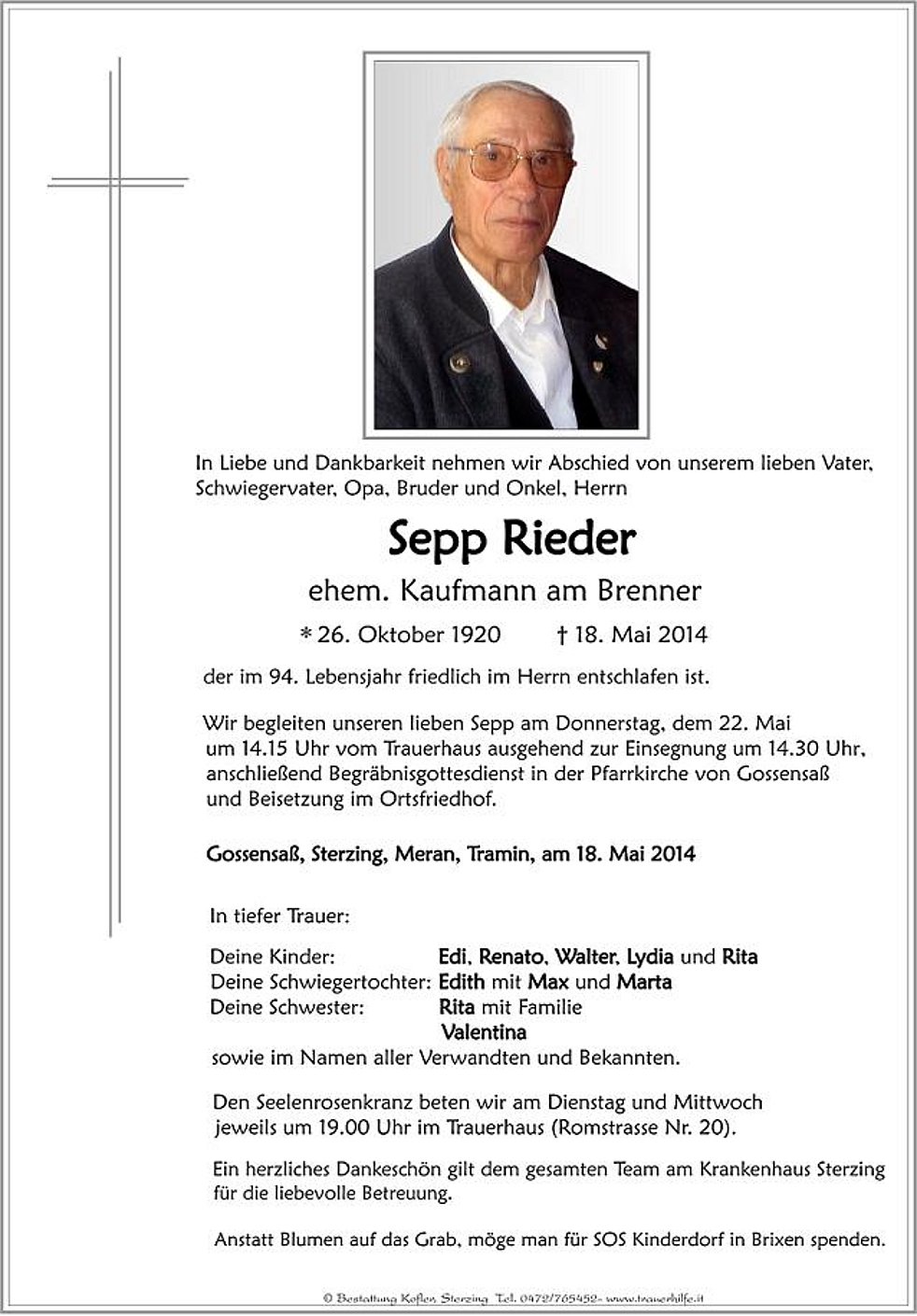 Anstatt Blumen auf das Grab, möge man für SOS Kinderdorf in Brixen spenden.