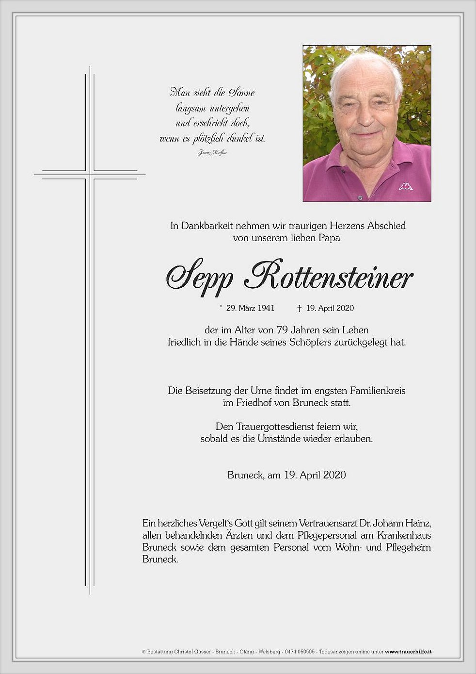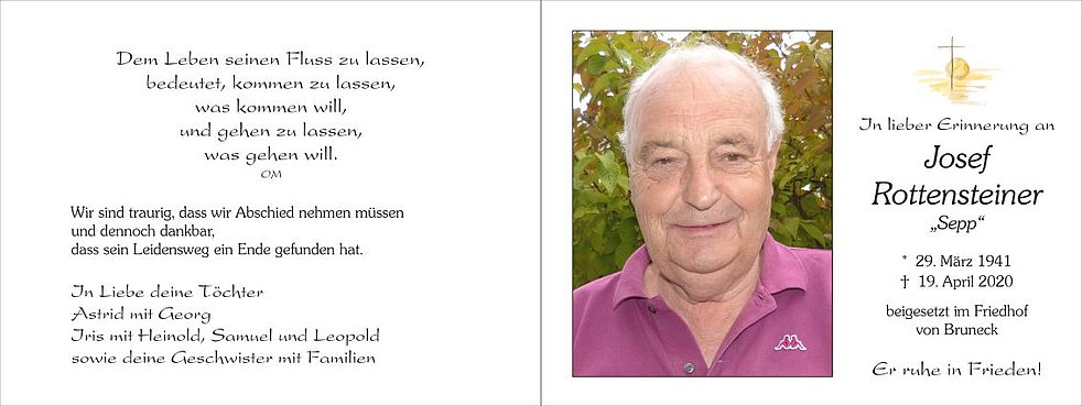 Die Verabschiedung, mit anschließender Beisetzung der Urne, findet im engsten Familienkreis im Friedhof von Bruneck statt.