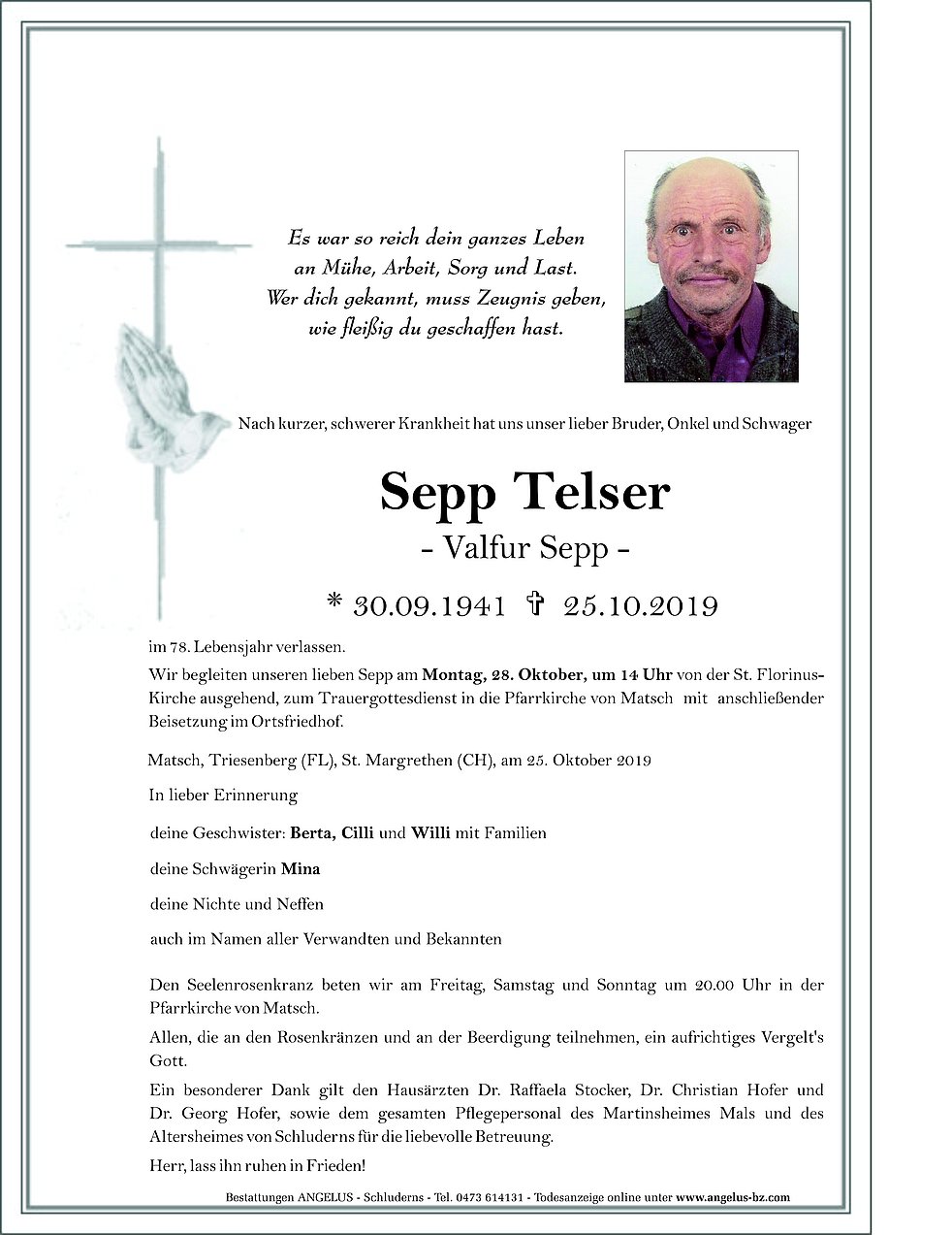 Wir begleiten unseren lieben Sepp am Montag, 28. Oktober, um 14 Uhr von der St. Florinus-Kirche ausgehend, zum Trauergottesdienst in die Pfarrkirche von Matsch mit anschließender Beisetzung im Ortsfriedhof.