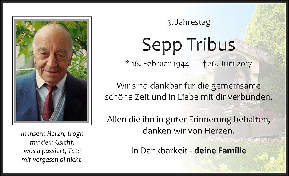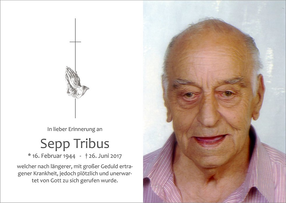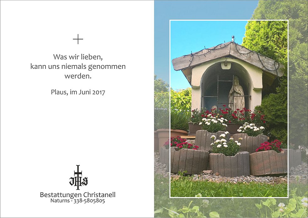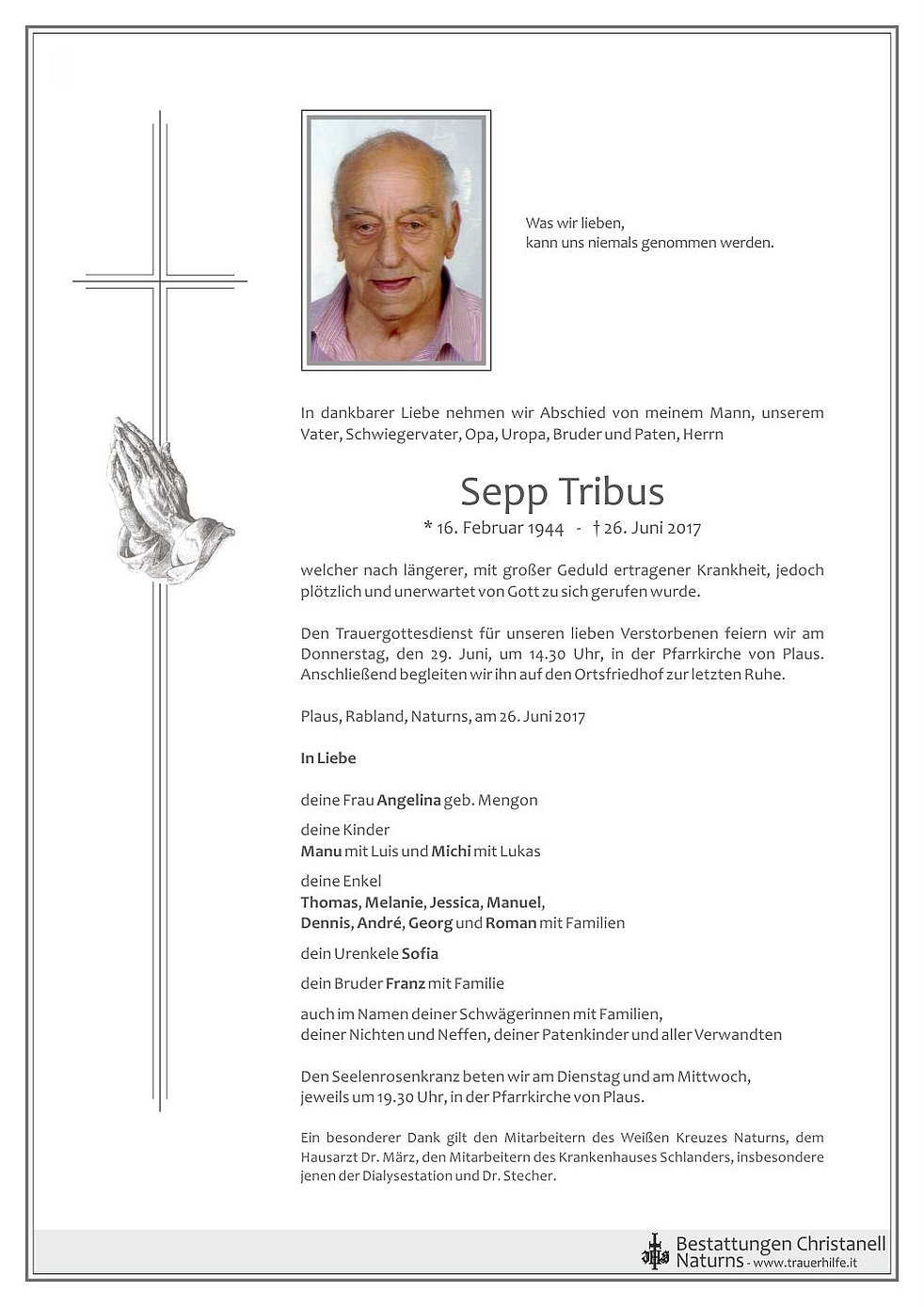 Den Trauergottesdienst für unseren lieben Verstorbenen feiern wir am Donnerstag, den 29. Juni, um 14.30 Uhr, in der Pfarrkirche von Plaus. Anschließend begleiten wir ihn auf den Ortsfriedhof zur letzten Ruhe.
