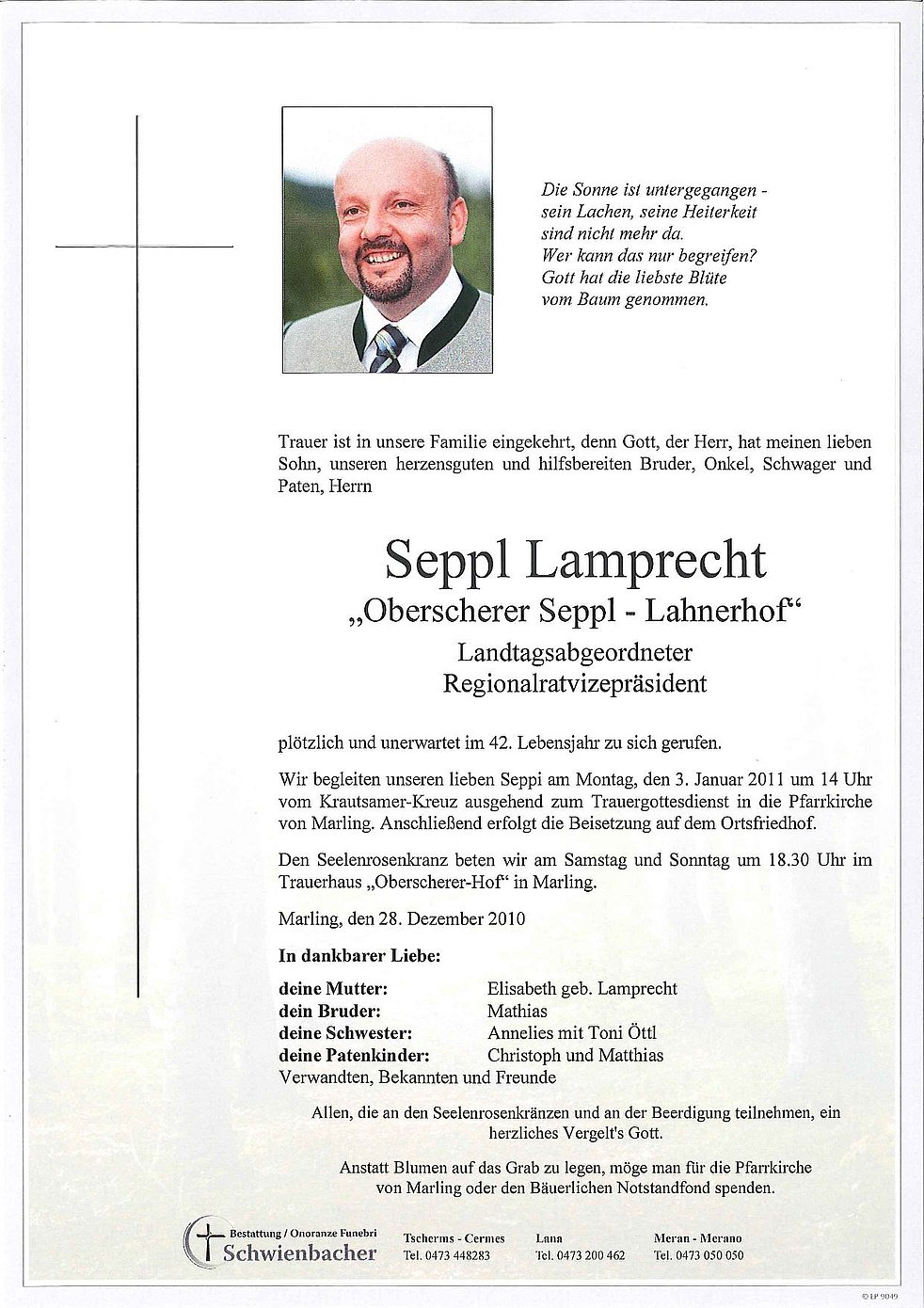 Wir begleiten unseren lieben Seppi am Montag, den 3. Januar 2011 um 14 Uhr vom Krautsamer-Kreuz ausgehend zum Trauergottesdienst in die Pfarrkirche von Marling. Anschließend erfolgt die Beisetzung auf dem Ortsfriedhof.