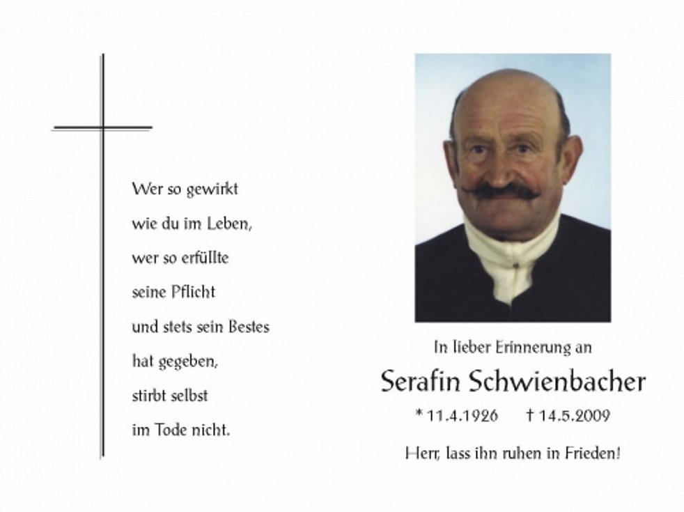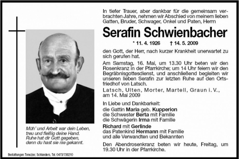 Am Samstag, 16. Mai, um 13.30 Uhr beten wir den Rosenkranz in der Pfarrkirche; um 14 Uhr feiern wir den Begräbnisgottesdienst und anschließend begleiten wir unseren lieben Serafin zur letzten Ruhe auf den Ortsfriedhof von Latsch.