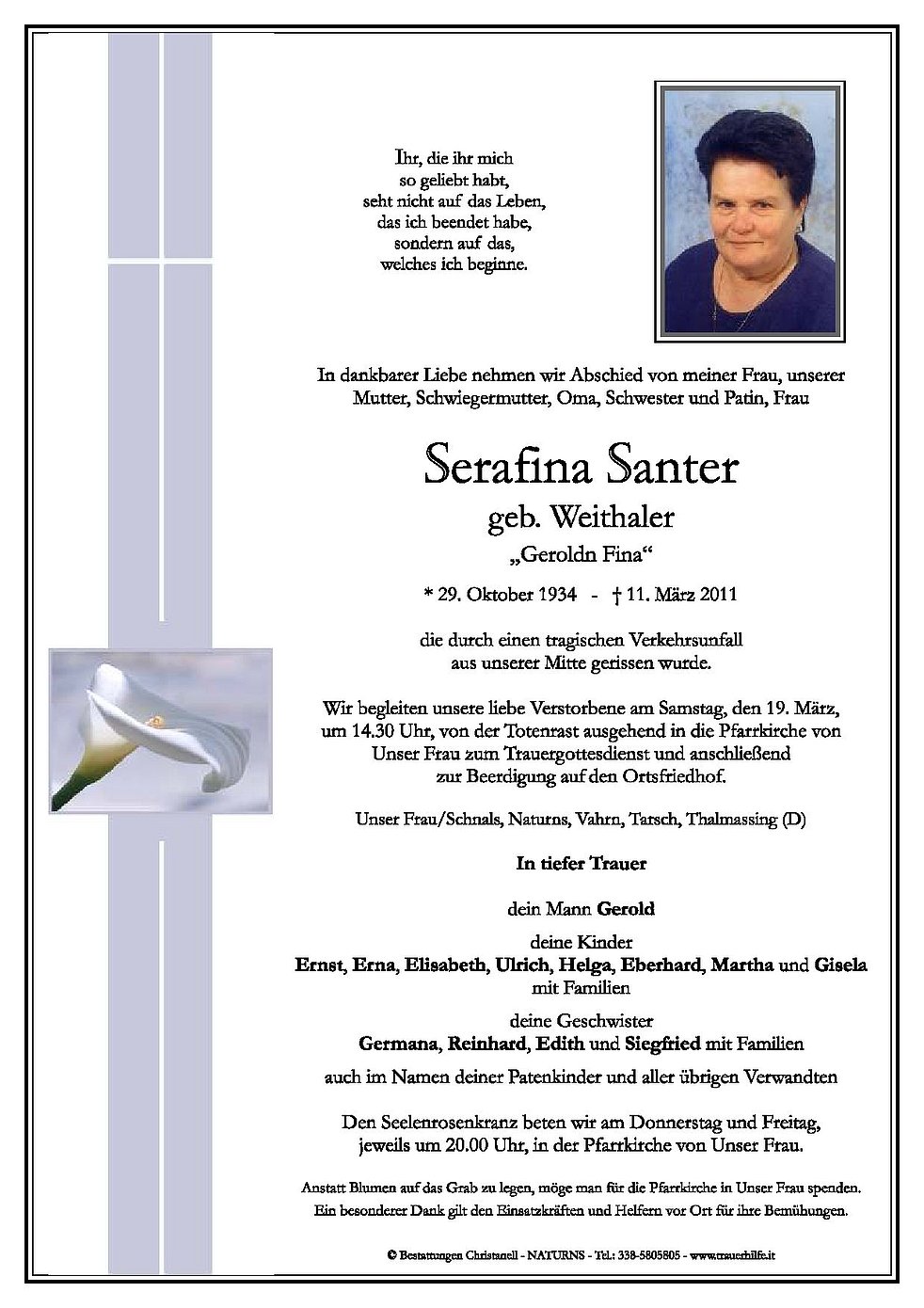 Wir begleiten unsere liebe Verstorbene, am Samstag, den 19. März, um 14.30 Uhr, von der Totenrast ausgehend in die Pfarrkirche von Unser Frau zum Trauergottesdienst und anschließend zur Beerdigung auf den Ortsfriedhof.