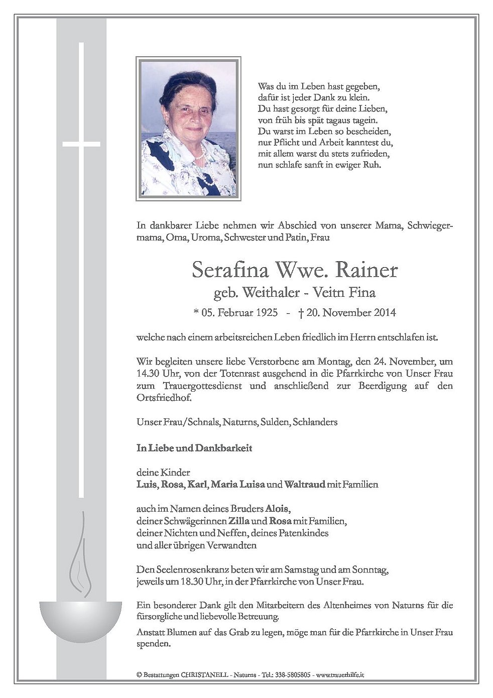 Wir begleiten unsere liebe Verstorbene am Montag, den 24. November, um 14.30 Uhr, von der Totenrast ausgehend in die Pfarrkirche von Unser Frau zum Trauergottesdienst und anschließend zur Beerdigung auf den Ortsfriedhof.