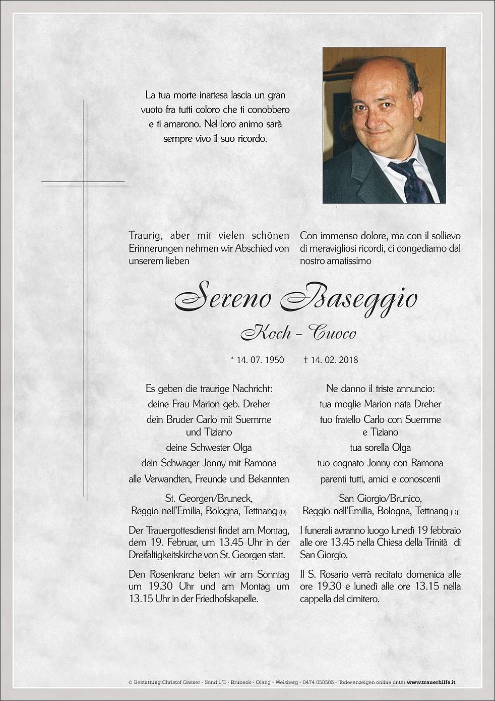 Der Trauergottesdienst findet am Montag, dem 19. Februar, um 13.45 Uhr in der Dreifaltigkeitskirche von St. Georgen statt.