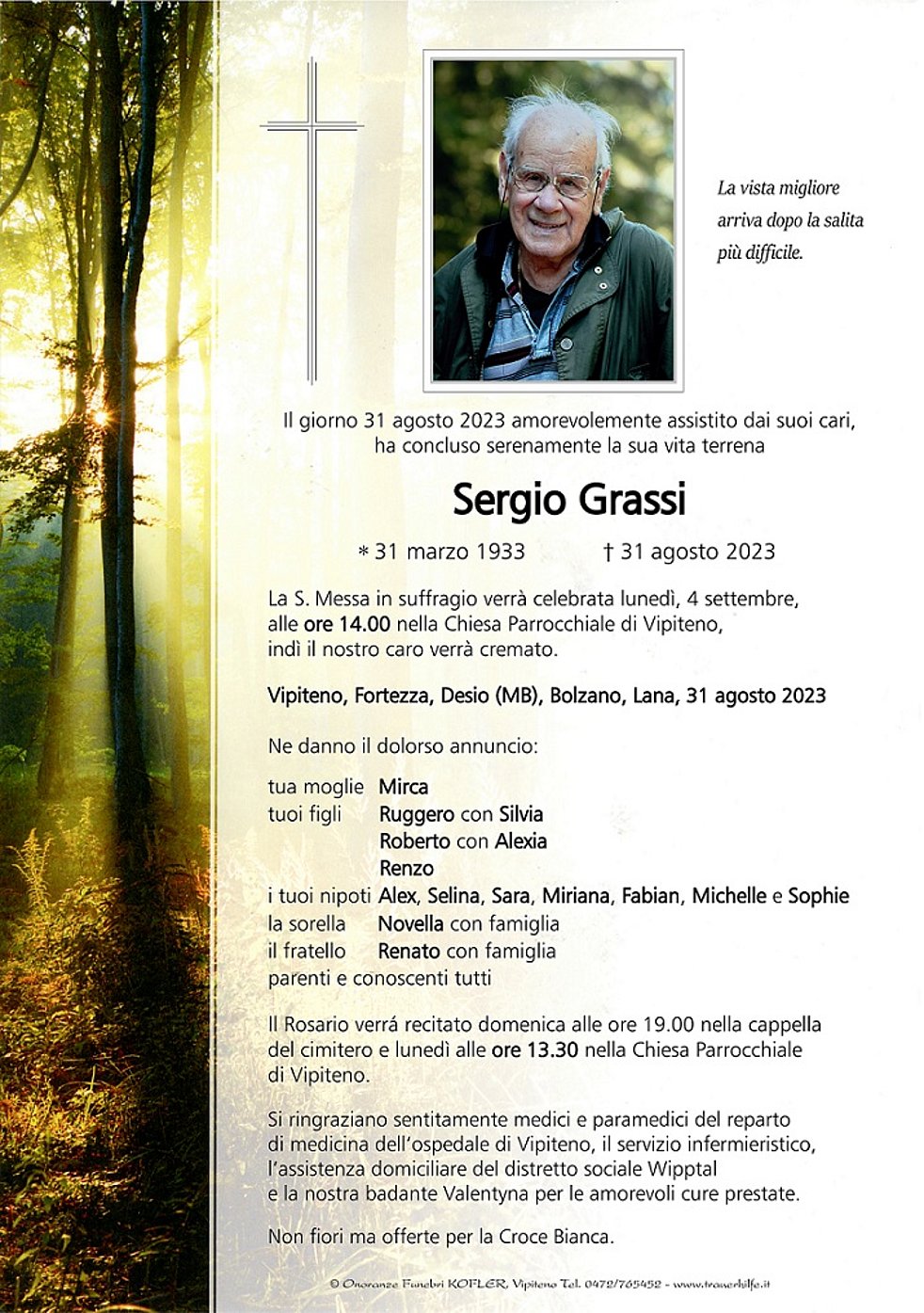 La S. Messa in suffragio verrà celebrata lunedì, 4 settembre, alle ore 14.00 nella Chiesa Parrocchiale di Vipiteno, indì il nostro caro verrà cremato.