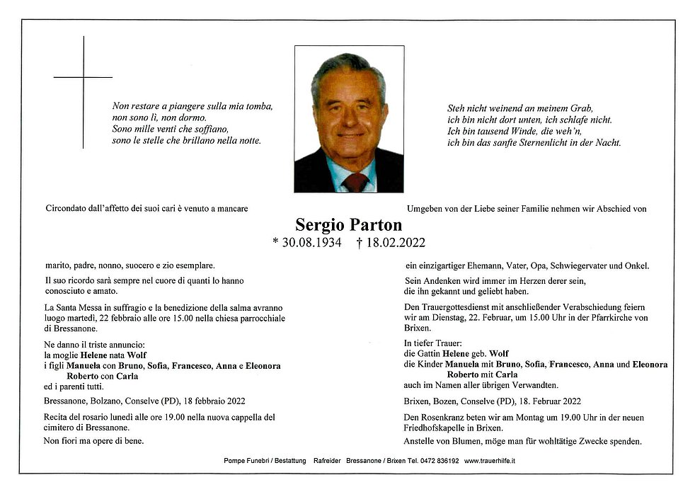 La Santa Messa in suffragio e la benedizione della salma avranno luogo martedì, 22 febbraio alle ore 15.00 nella chiesa parrocchiale di Bressanone.