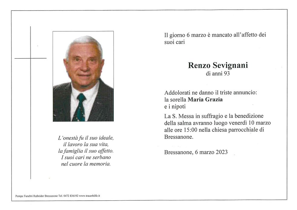 La S. Messa in suffragio e la benedizione della salma avranno luogo venerdì 10 marzo alle ore 15:00 nella chiesa parrocchiale di Bressanone.