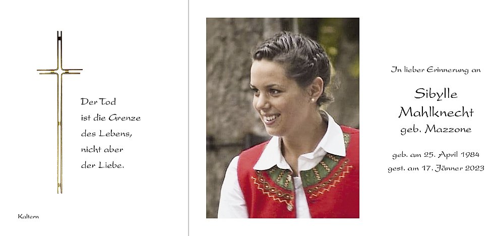 Tief erschüttert und in unsagbarem Schmerz müssen wir Abschied nehmen von meiner geliebten Frau, unserer Tochter, Schwester, Schwiegertochter, Schwägerin, Nichte, Patenkind