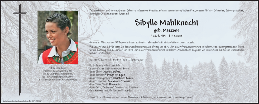 Den Trauergottesdienst feiern wir am Samstag, den 21. Jänner 2023 um 14.30 Uhr in der Franziskanerkirche in Kaltern.