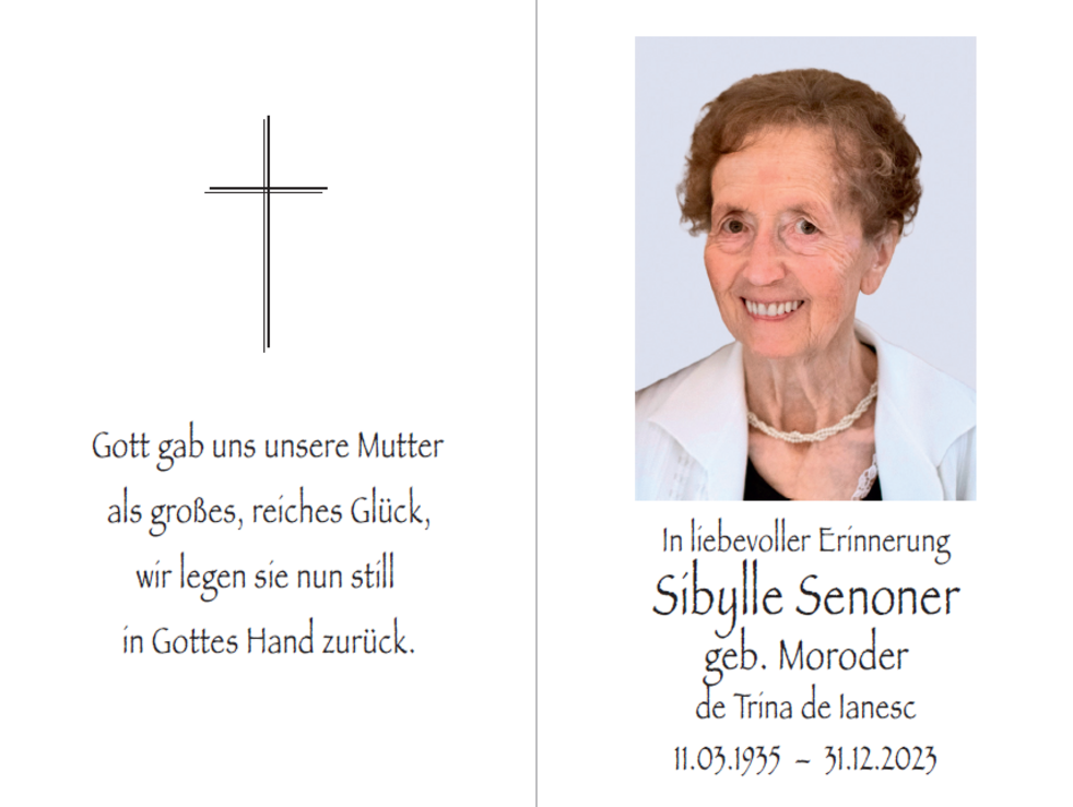 Wir begleiten unsere liebe Mama am Dienstag, den 2. Jänner, um 14.15 Uhr von der Antoniuskirche ausgehend, in die Pfarrkirche von St. Ulrich, wo wir den Trauergottesdienst feiern und anschließend zur letzten Ruhe in den Ortsfriedhof.