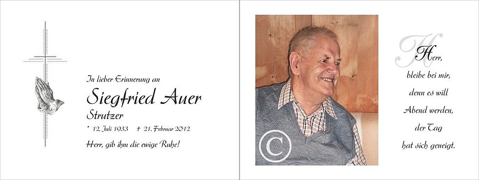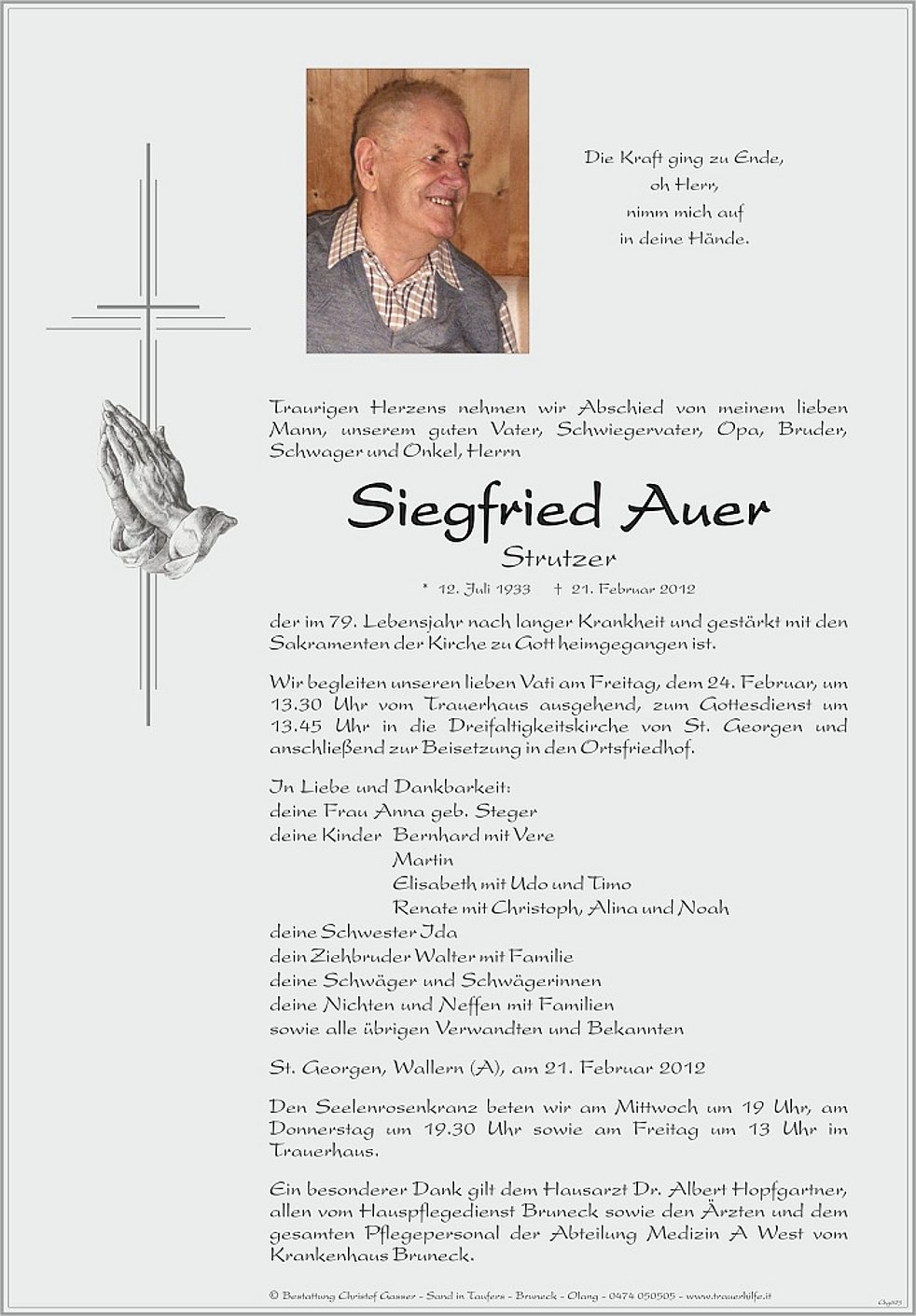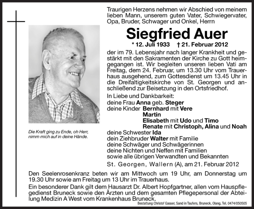 Wir begleiten unseren lieben Vati am Freitag, dem 24. Februar, um 13.30 Uhr vom Trauerhaus ausgehend, zum Gottesdienst um 13.45 Uhr in die Dreifaltigkeitskirche von St. Georgen und anschließend zur Beisetzung in den Ortsfriedhof.