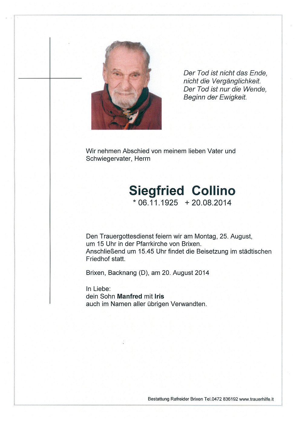 Den Trauergottesdienst feiern wir am Montag, 25. August, um 15 Uhr in der Pfarrkirche von Brixen.