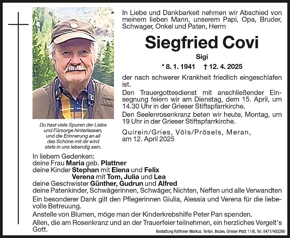 Den Trauergottesdienst mit anschließender Einsegnung feiern wir am Dienstag, dem 15. April, um 14.30 Uhr in der Grieser Stiftspfarrkirche.