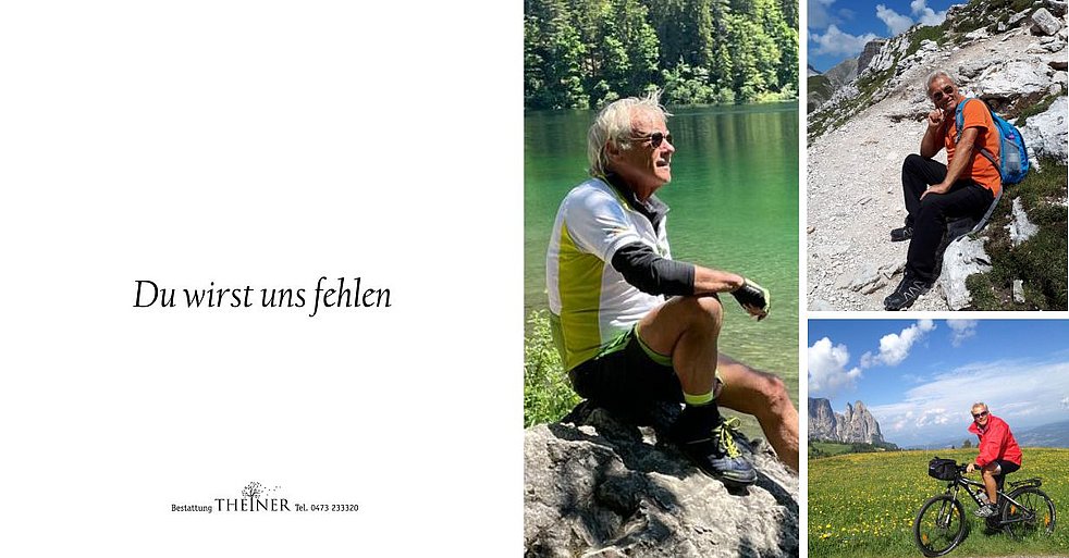 Den Trauergottesdienst mit anschließender Einsegnung feiern wir am Mittwoch, den 28. Juni 2023, um 15 Uhr in der Pfarrkirche von Algund. Unser lieber Sigi wird eingeäschert und im engsten Familienkreis im Friedhof von Algund beigesetzt.