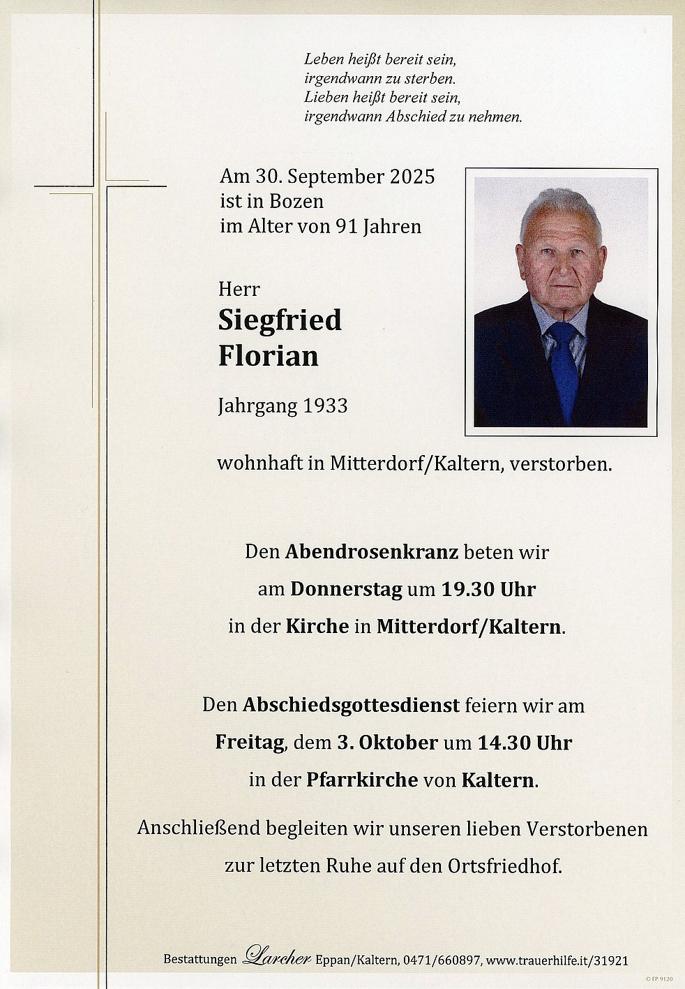 Den Abschiedsgottesdienst feiern wir am Freitag, dem 3. Oktober um 14.30 Uhr in der Pfarrkirche von Kaltern. Anschließend begleiten wir unseren lieben Verstorbenen zur letzten Ruhe auf den Ortsfriedhof.