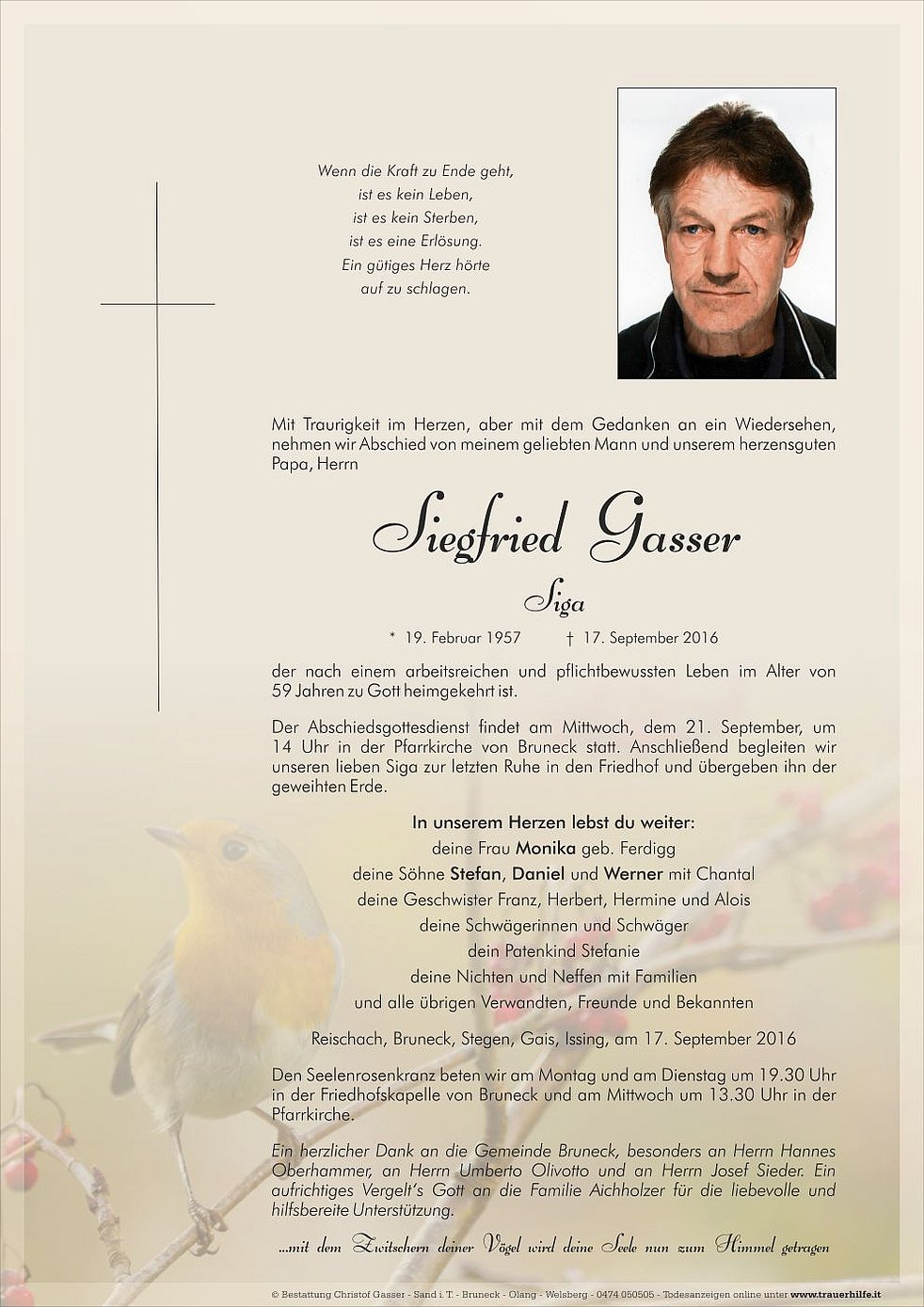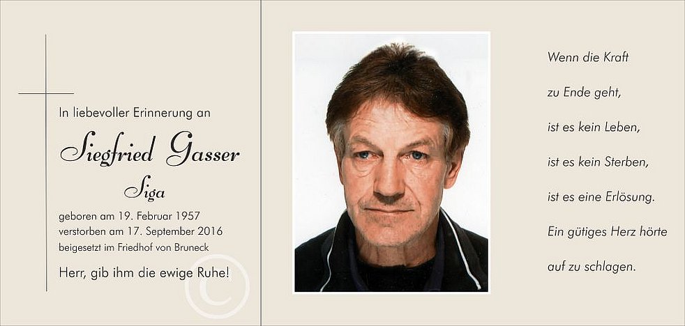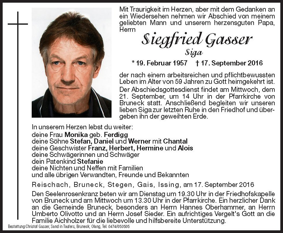 Der Abschiedsgottesdienst findet am Mittwoch, dem 21. September, um 14 Uhr in der Pfarrkirche von Bruneck statt. Anschließend begleiten wir unseren lieben Siga zur letzten Ruhe in den Friedhof und übergeben ihn der geweihten Erde.