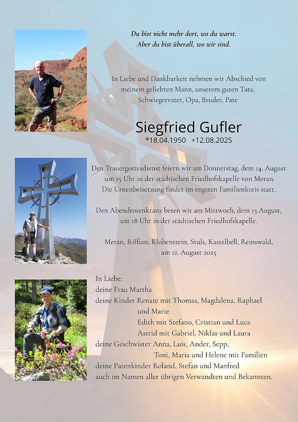 Begräbnisgottesdienst: 14.08. - 15:00 Uhr Städtischer Friedhof Meran
