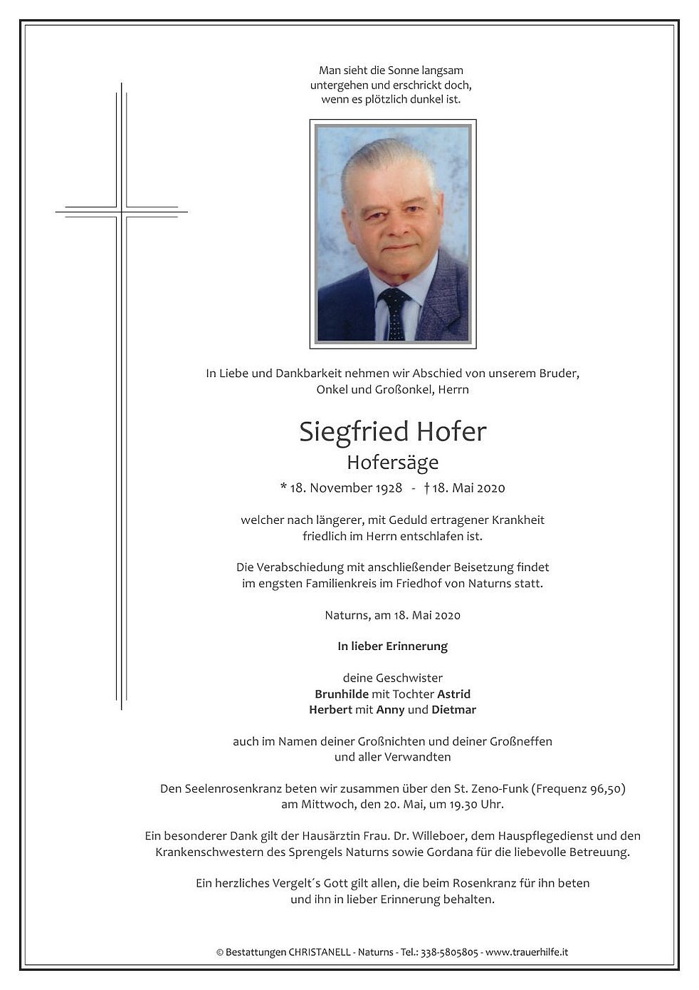 Die Verabschiedung mit anschließender Beisetzung findet im engsten Familienkreis im Friedhof von Naturns statt.